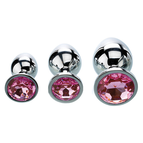 Loud booty luxury and kinky anal fun... all at the same time! These super-smooth solid metal anal plugs are adorned with a brilliant faux jewel to add visual excitement as you experience butt-tingling thrills. Also great for bling-adorned prostate play, too! Each solid metal plug offers a weight challenge while it stimulates. Discover and develop new muscle control with up to 5.7 ounces of booty-tastic thrills. Now that's some heavy lifting! Free storage bag included. Made from aluminum with an ABS plastic jewel.