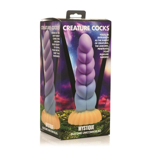 What’s that light in the mystical forest glade? Could it be… a unicorn? It is! And now you can live out your wildest, kinkiest, horniest fantasies. The Creature Cocks Mystique Unicorn Dildo is an untamed beast of a sex toy. It has a unique spiral texture that will thrill you with every deep thrust, and a tip that starts out at a satisfyingly big 1.5 inches wide and gets even bigger the further you go, all the way to a whopping 2.4 inches thick! Stick its suction cup base to most hard surfaces and take a galloping ride you’ll never forget! 8.3 inches total length, 7.3 by 2.4 inches insertable. Silicone.
