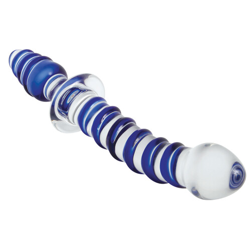 Great for men and women alike, this versatile double ended glass dildo will help you discover new levels of pleasure by yourself or with a partner! The main shaft is perfectly curved to find and thrill your G-Spot or P-Spot. The plug-shaped end is ideal for backdoor play. Textured swirls add juicy stimulation with every thrust. Warm it up or cool it down for extra stimulation during temperature play. 9 by 1.75 inches total. Glass.