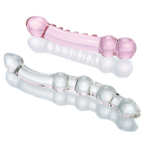Explore your own limits of pleasure with this set of two ultra-smooth glass dildos! You’ll be blushing as you feel the 7 inch pink dildo’s raised texture and rounded tips slide deep inside. Or reach for big, rippling thrusts with the curvy 8.5 inch clear dildo! Keep both for yourself or share this naughty glass dildo set with your favorite playmate.