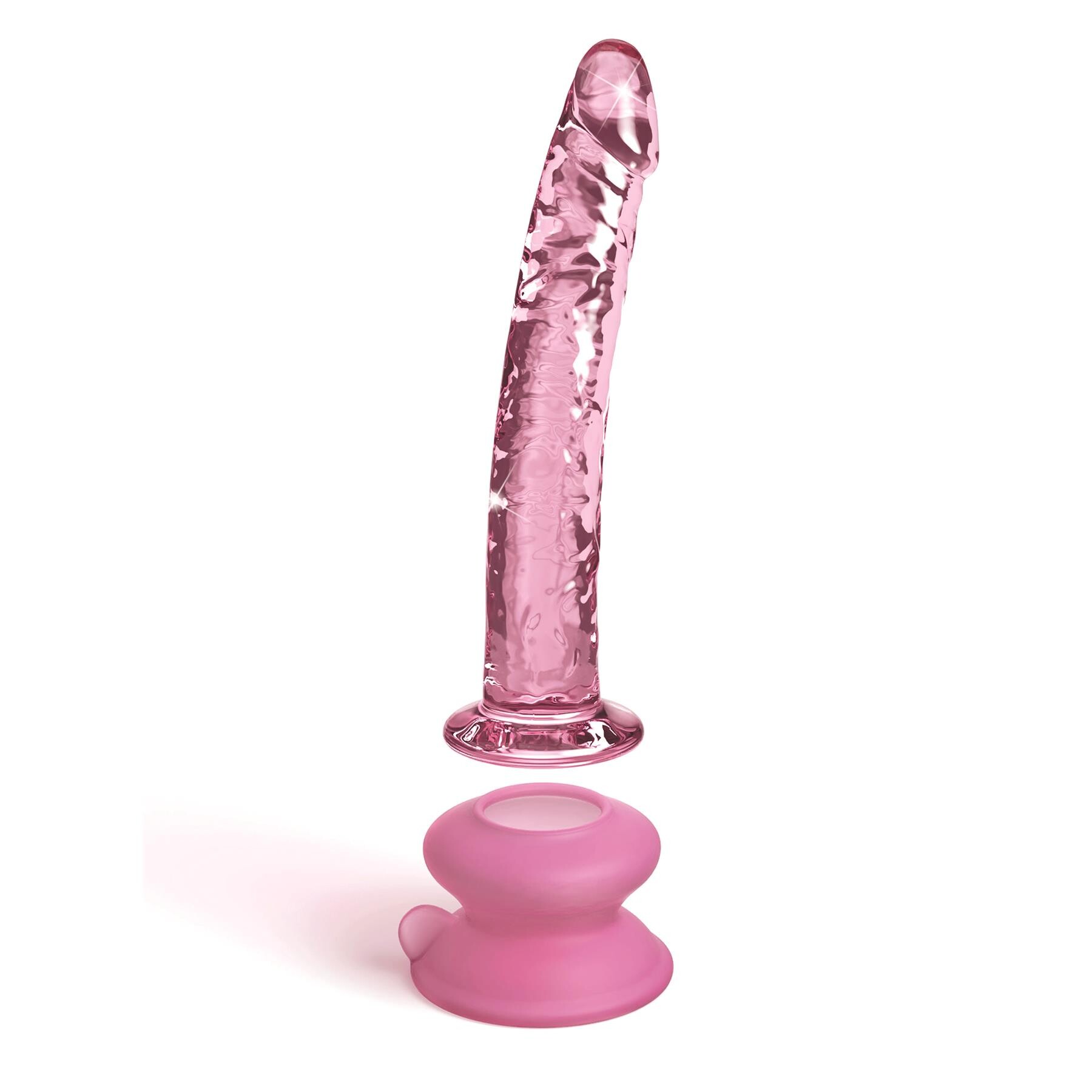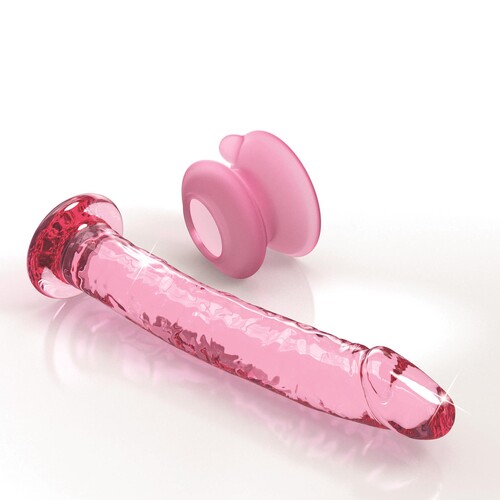 Combine the Icicles Realistic Pink Glass Dildo With Suction Cup to your favorite strap-on harness for a new experience. The suction cup base can be removed so you can use the glass dildo for other types of sex toy play as well. Pro Tip: as you clean your dildo after use, thoroughly remove all traces of lube from the silicone base to help keep it in good condition.