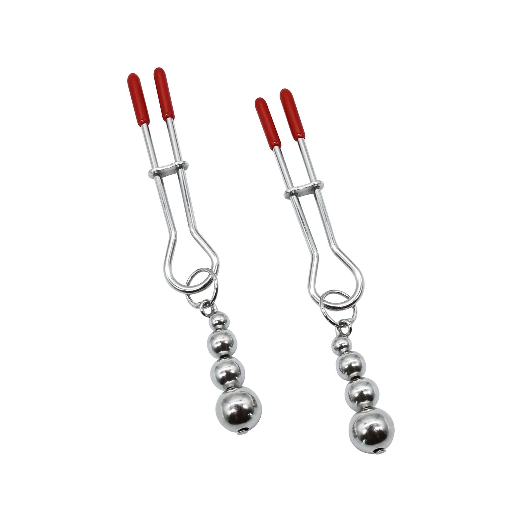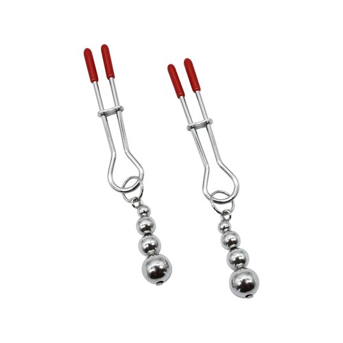 Nothing says pleasure quite like a pinch! These adjustable nipple clamps squeeze just as tight as you like, adding an extra sensual layer to your play. The rubber tips ensure your comfort while the dangling beads lightly pull on your sensitive buds. Step out in this little accessory and your lover will know exactly what you’re after! 3.8 by 1.5 inches. Metal & TPE.