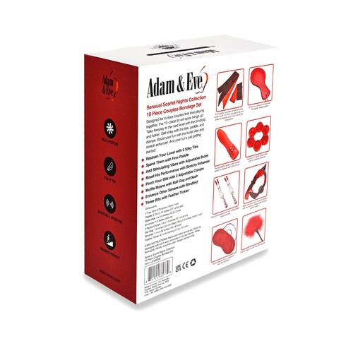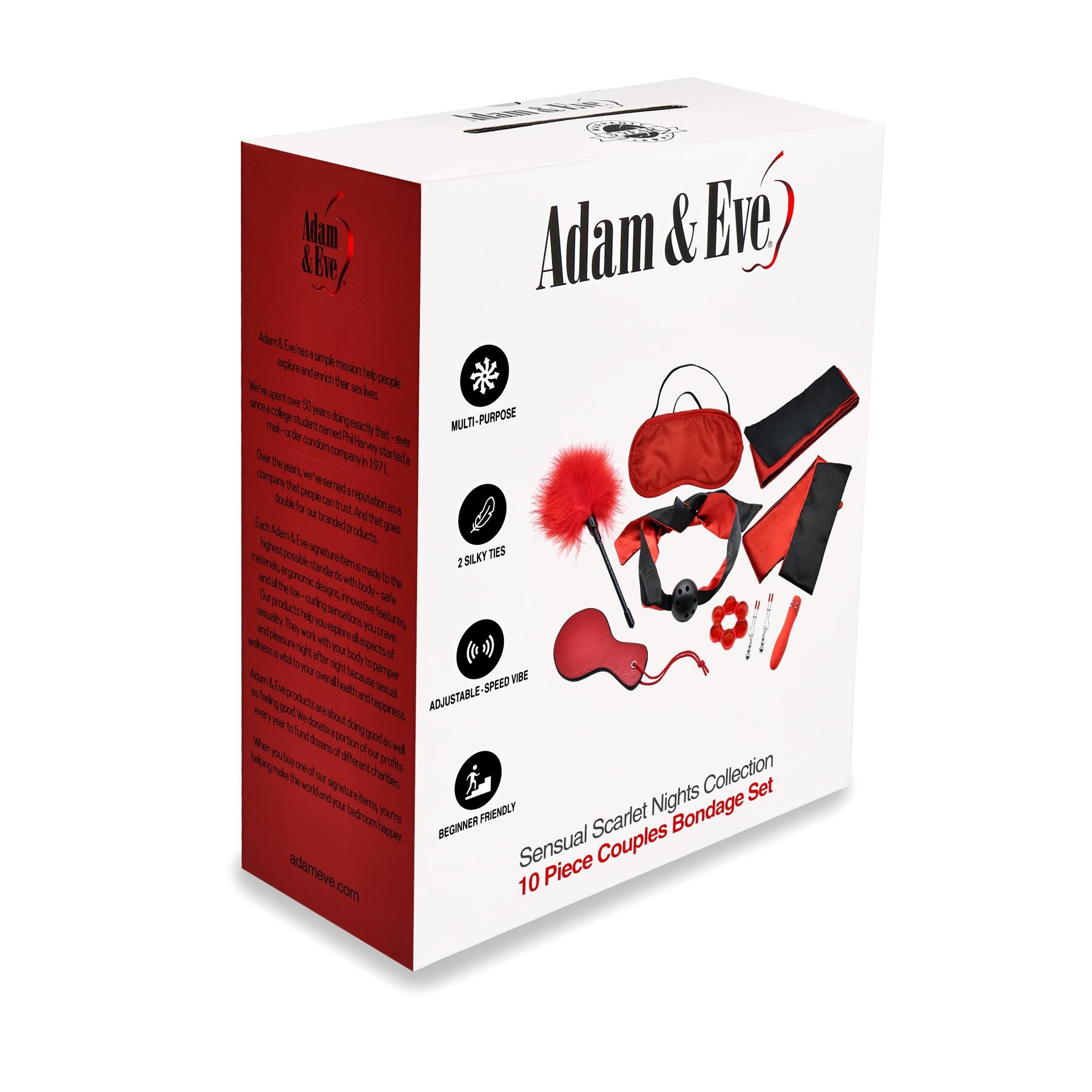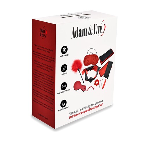 Spice up your bedroom like never before. The Adam & Eve Sensual Scarlet Nights Bondage Collection is great for curious couples, kink lovers & more! This 10-piece set will keep you busy for as long as you like getting off! Introduce a new toy every night or use them all at once, the only limit is your drive!