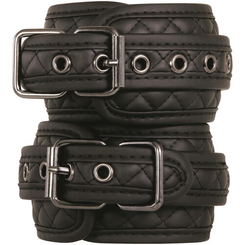 - Cuffs feature heavy-duty metal buckles for a secure fit