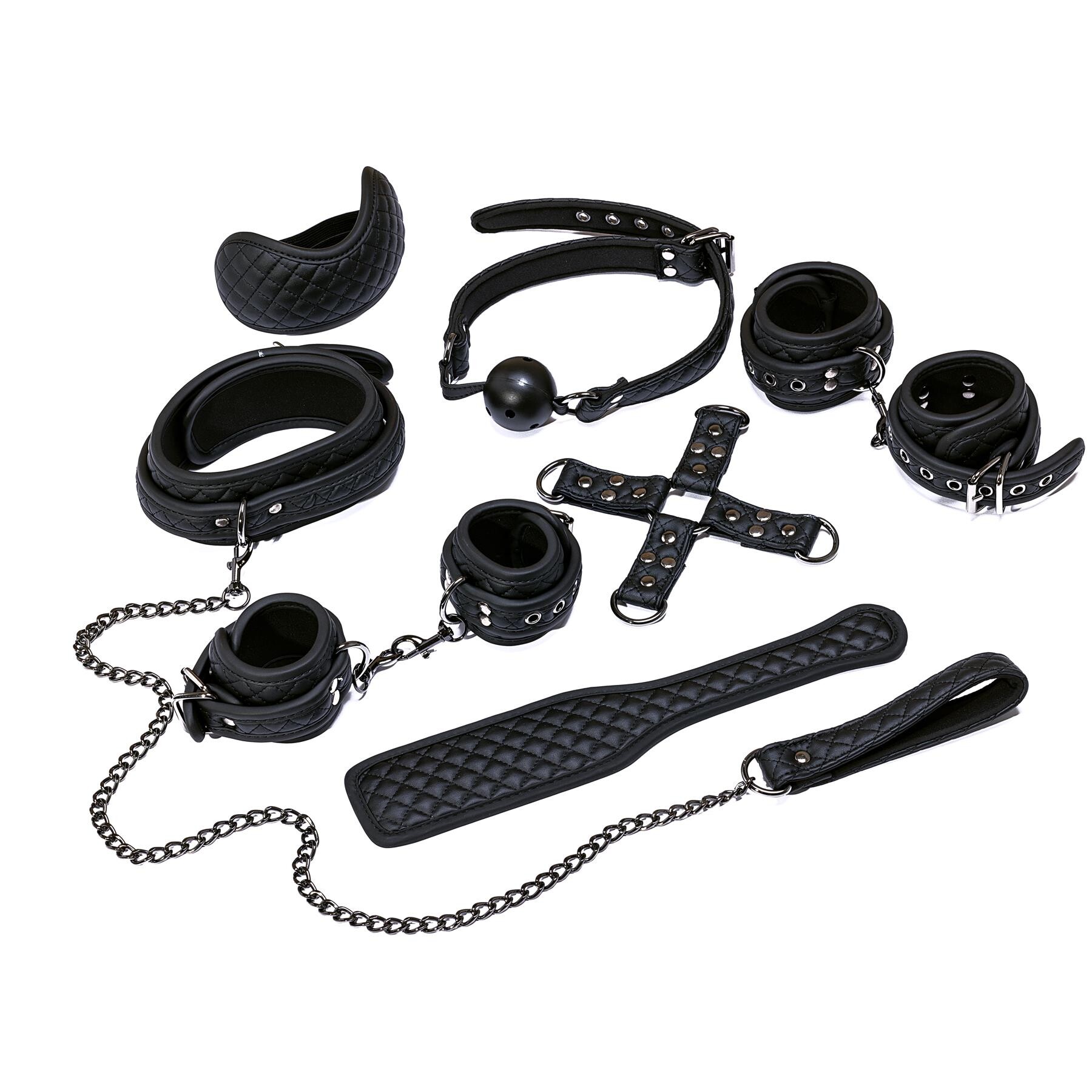 - 4 wrist & ankle cuffs, cross buckle, finger vibe, paddle, collar with leash, ball gag & blindfold included