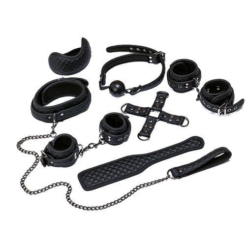 When your kinkiest side needs satisfaction, turn to this all-in-one ultimate BDSM set! 4 Padded Wrist & Ankle Cuffs restrain your lover. Cross Buckle connects all the cuffs for even kinkier play. Spanking Paddle disciplines with a flick of the wrist. Collar & Leash turn your lover into your servant. Ball Gag ensures that silence is golden. Blindfold enhances other senses for more intense play. Save $102.65 on this 7-piece set valued at $212.65! Made from matching dark metal with sumptuously soft padded diamond-stitched faux leather.