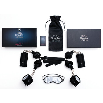 From the official Fifty Shades of Grey Collection! Turn erotic fiction into erotic fact in the privacy of your own bedroom. Inspired by the erotic novels of author E.L. James, this easy-to-use kit puts pulse-pounding passion at your fingertips in just minutes. Just place the webbing underneath your mattress, then set out an adjustable restraint on each corner of your bed. Attach wrist and ankle cuffs to restraints. Have your partner put on the Velcro cuffs. Add the soft blindfold for increased sensory sensitivity. Now tease, tantalize and pleasure your helpless partner, bound to your bed like prey on a spider's web. When play time is over, just stuff everything under the mattress until next time, or use the official Fifty Shades of Grey storage box. Fits King & Queen size mattresses. Polyester with metal hardware.