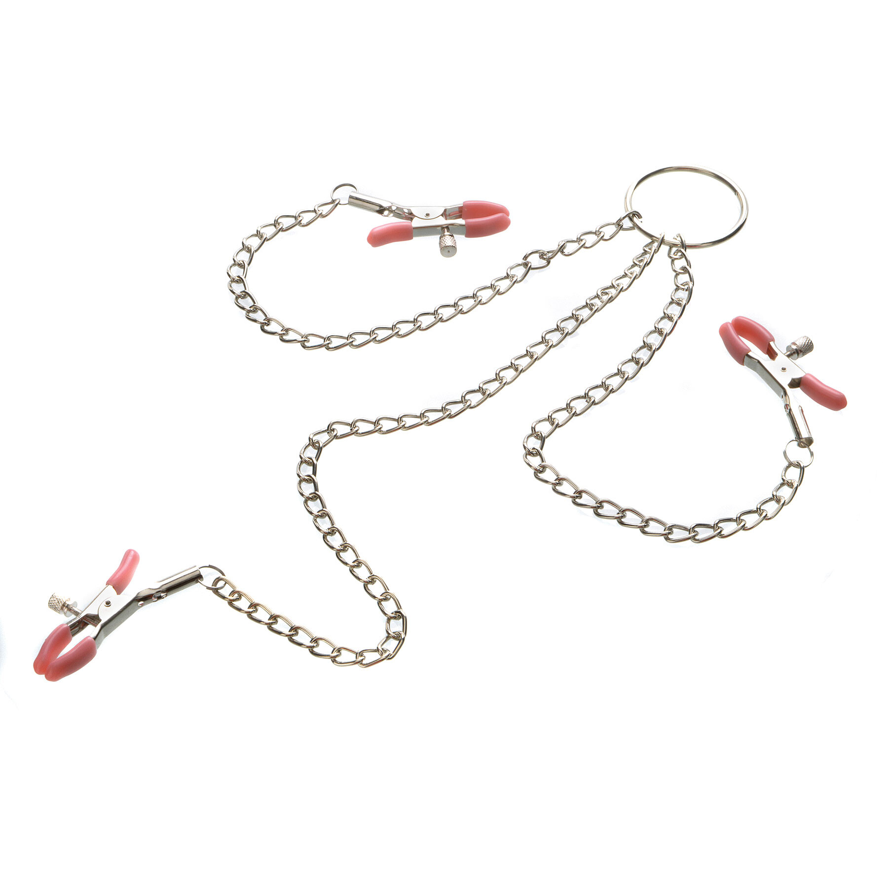 The three clamps are all linked together with metal chains to a central ring. The weighty 11-inch nipple chains & 12-inch clit chain naturally pull on the clamps with every move you make – creating a stimulating sensation like someone playing with your bits. Simply tug on the central ring for more intense thrills.