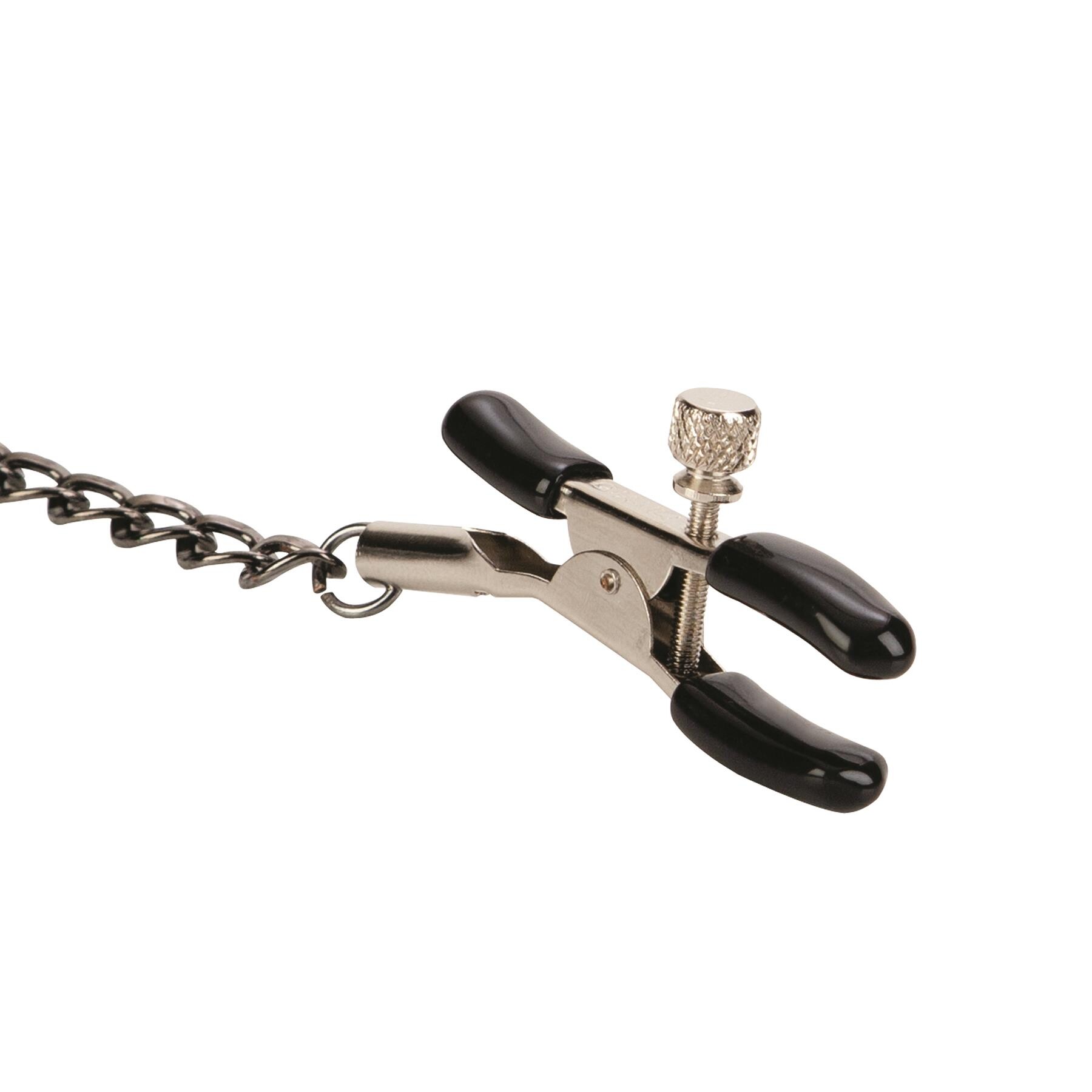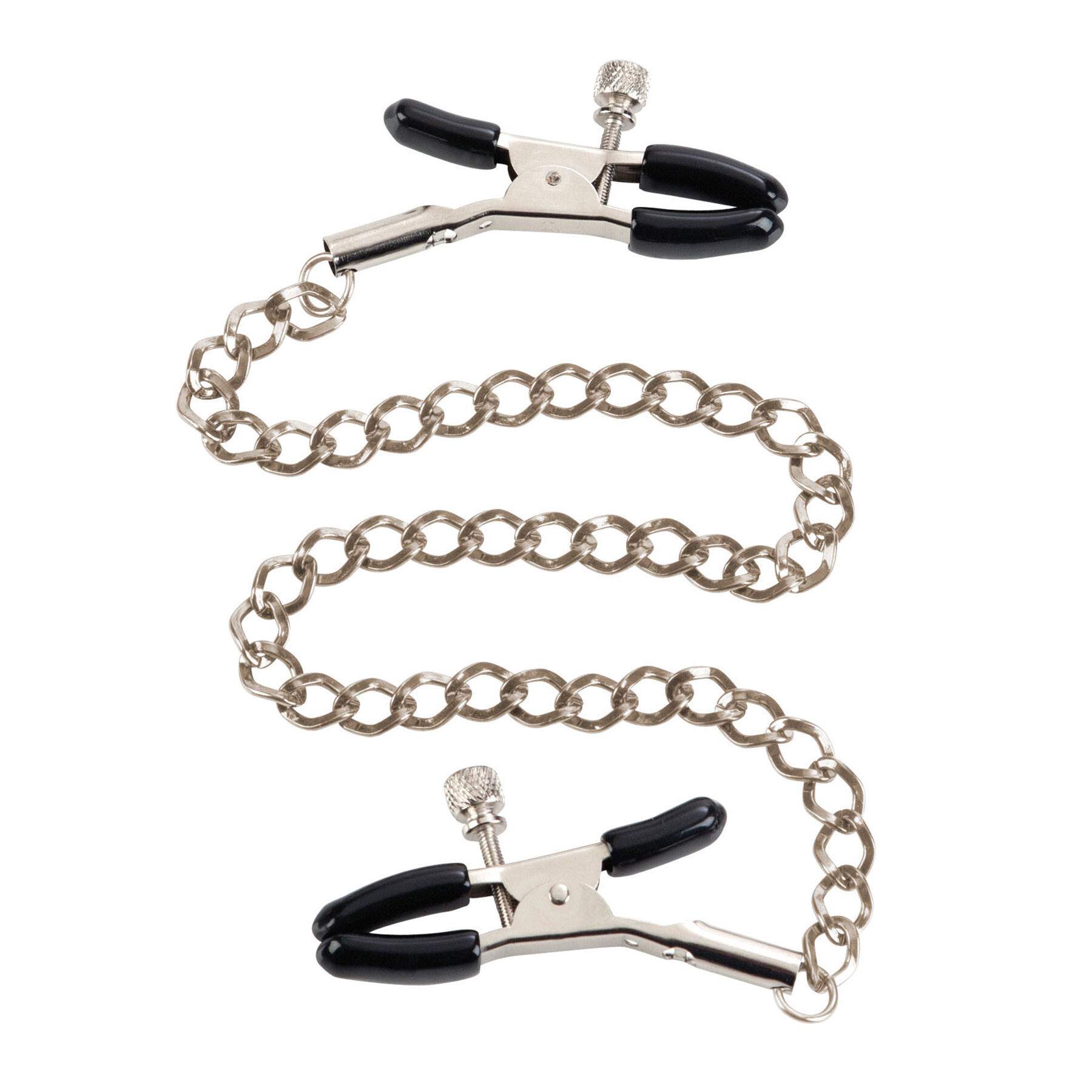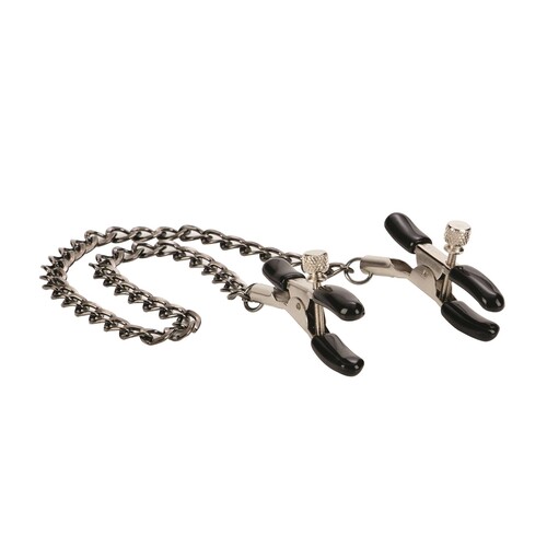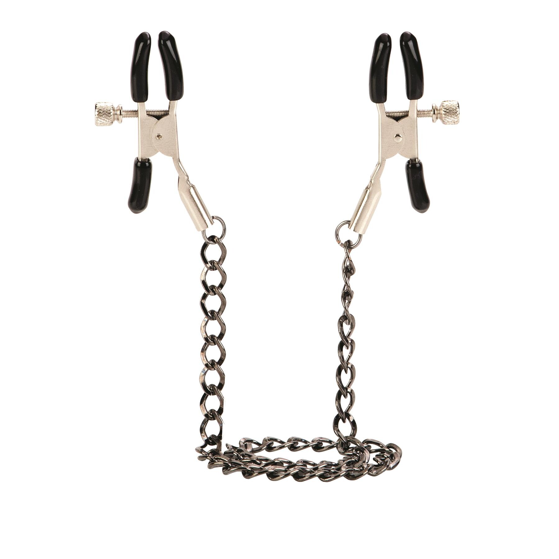 Enjoy hands-free nipple play whenever the mood strikes with these wild metal nipple clamps! Both rubber-tipped clamps come with fully adjustable tension controls, so you can feel the perfect soft or firm grip! That makes them great for users of all experience levels, especially beginners! You’ll moan with every move as the attached 12-inch chain swings, tugging your buds just like a lover. Clamps measure 2.25 inches long. Made from metal with rubber tips.