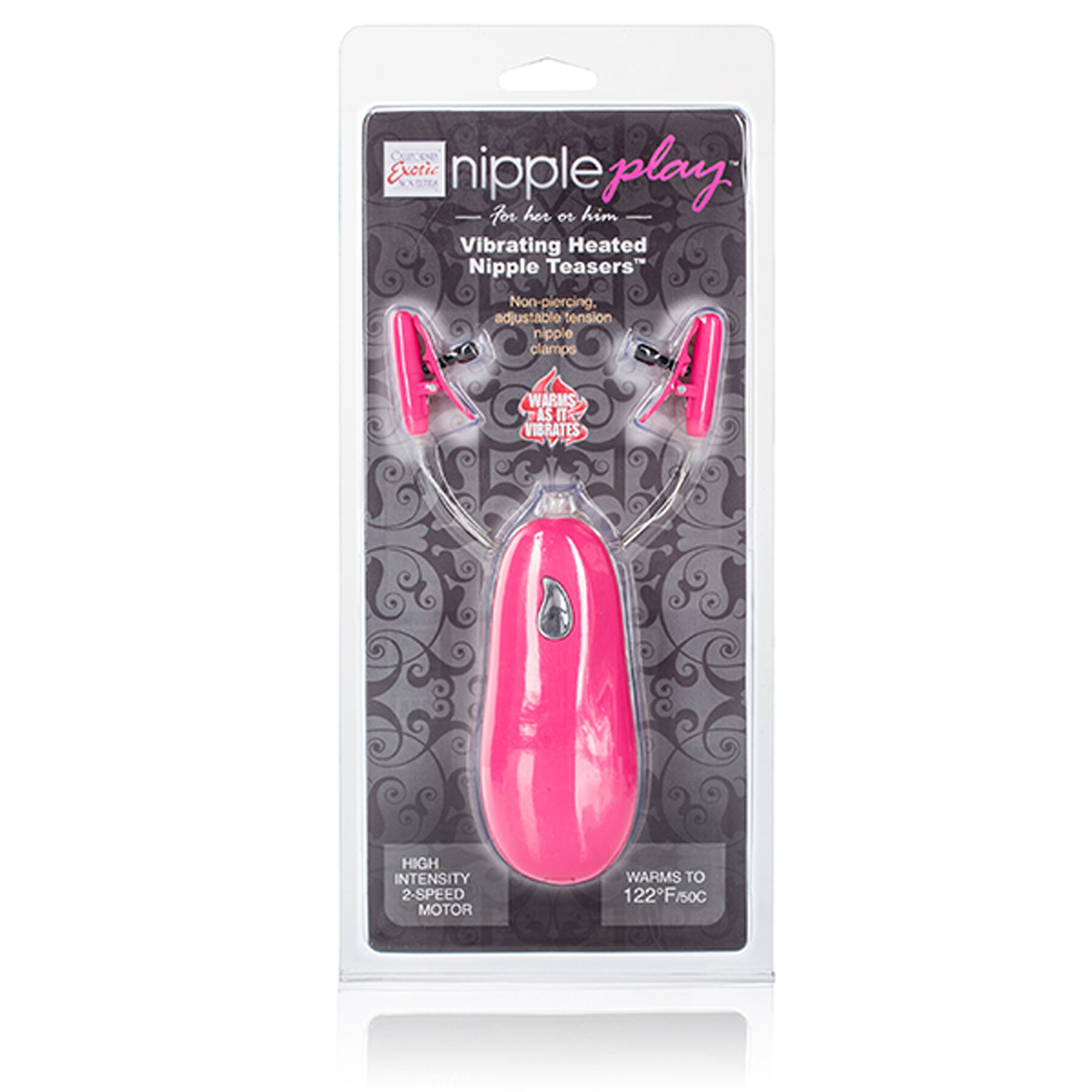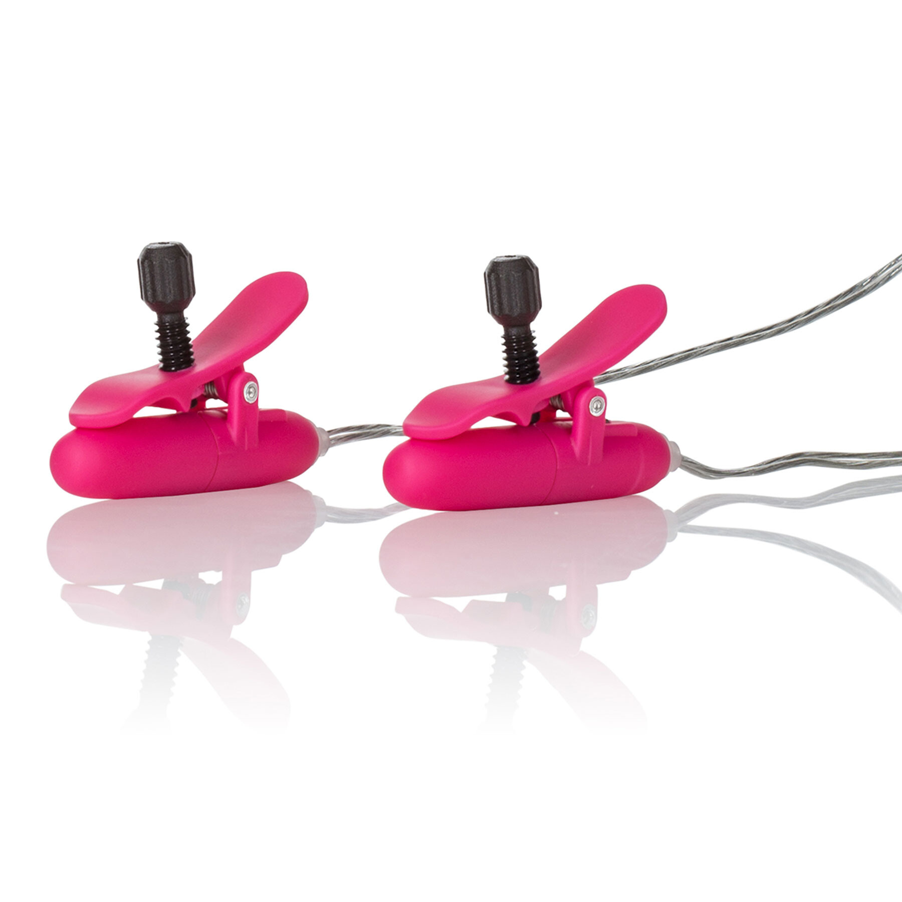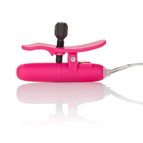 Feel the perfect pinch as these clamps provide just the right amount of tension to make your stress melt away! The adjustable clamps provide a persistent pinch to maintain your arousal and stimulation while enhancing your pleasure. Increase your fun even more with 2 thrilling vibration modes. The clamps even warm up for a relaxing & arousing feel. And they do it all hands-free so you can save your fingers for other purposes! Clamps measure 1.5 by 0.25 inches. ABS plastic. Uses 2 AA batteries (sold separately).