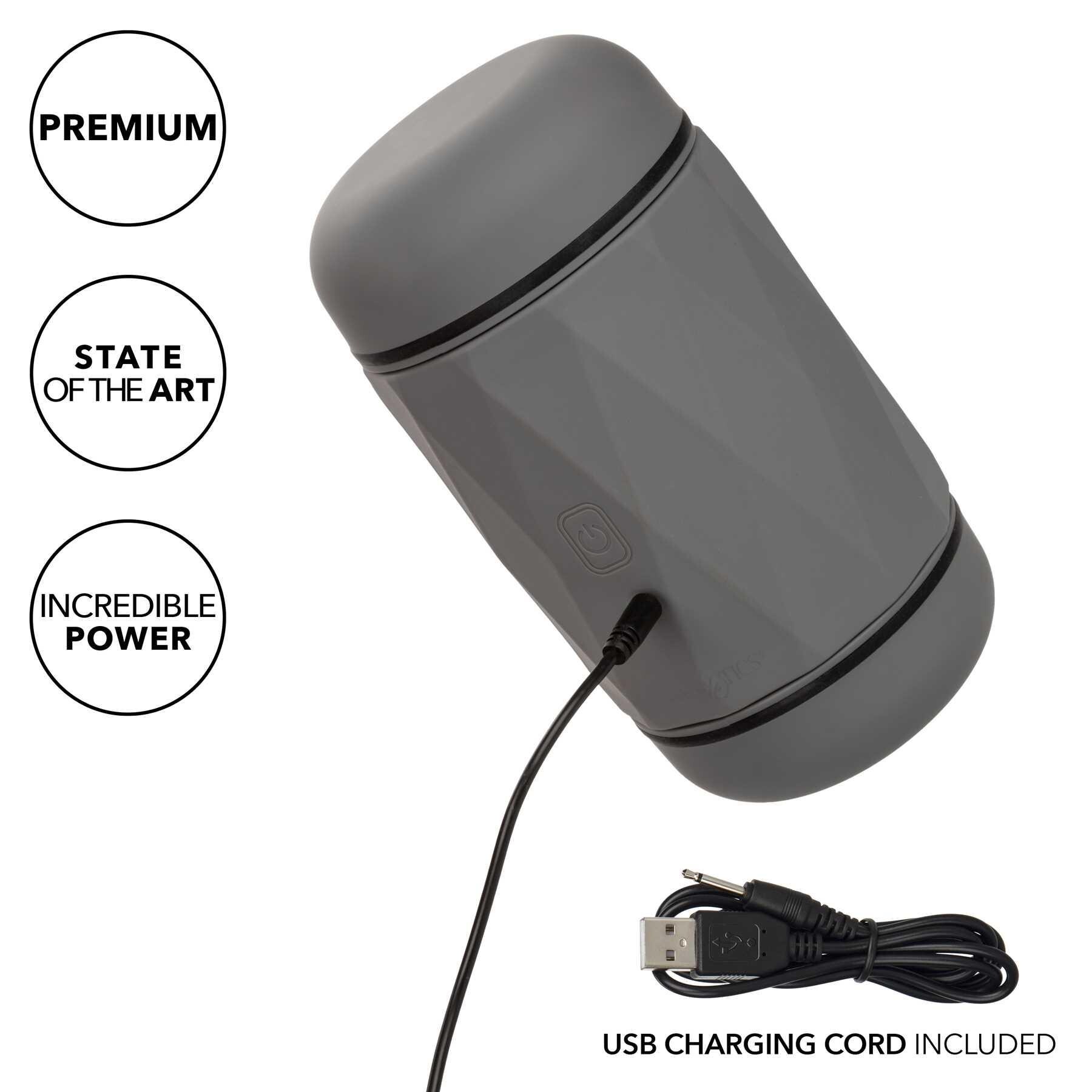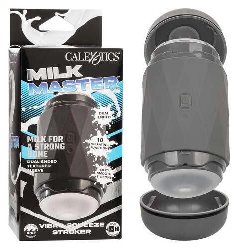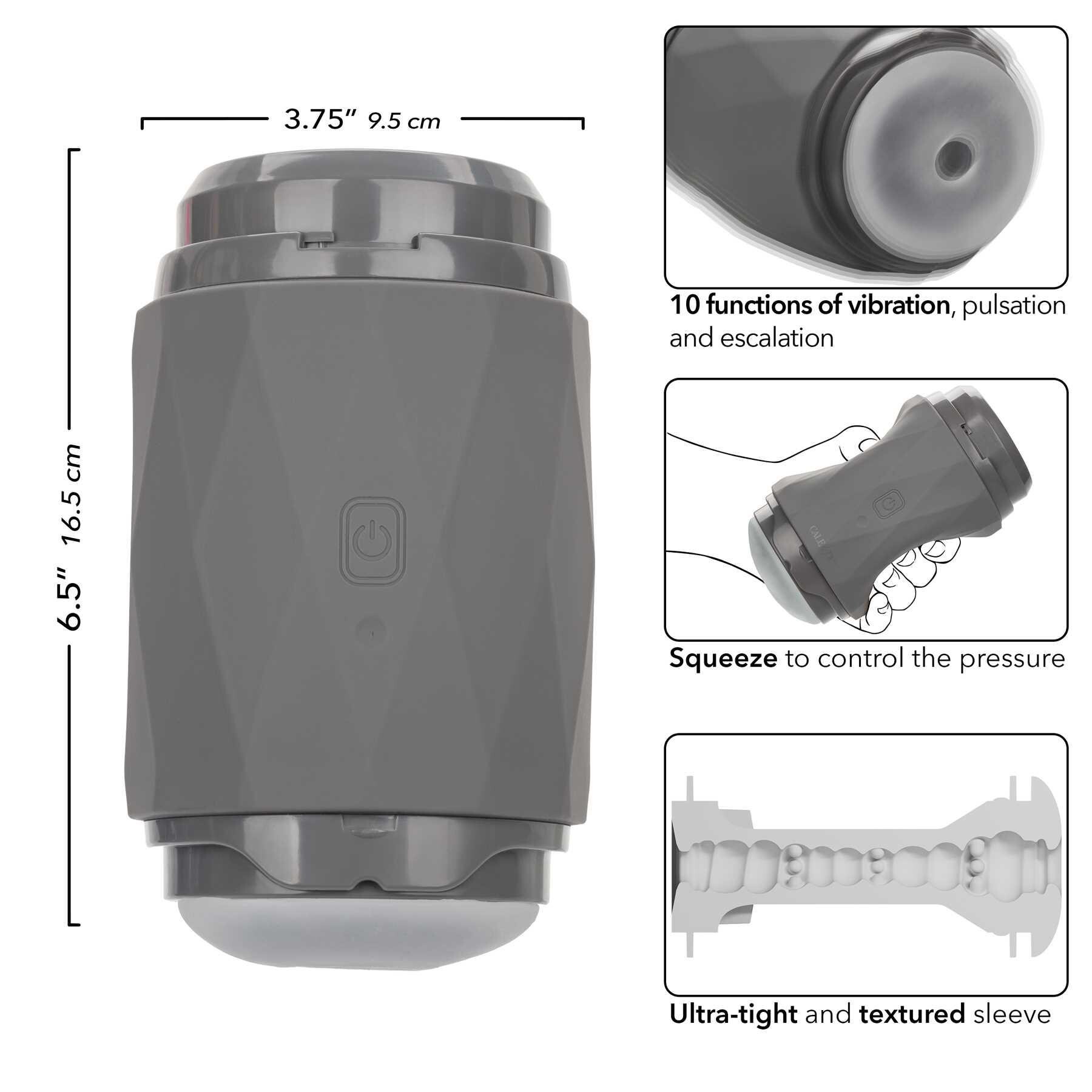 Drain yourself to the last drop with this intense squeezable vibrating stroker! Twist off the stroker’s protective end caps to reveal two different entries. One starts with teasing nubs. The other leads off with a super-tight opening! Both lead to a love tunnel lined with super-stimulating ridges and chambers. Need a tighter stroke? Squeeze the flexible case to amp up the intensity. Add in 10 balls-draining vibration functions and stroke ‘til you explode! Waterproof. 6.5 by 3.75 inches. Silicone case, polycarbonate caps, TPE sleeve. Rechargeable.