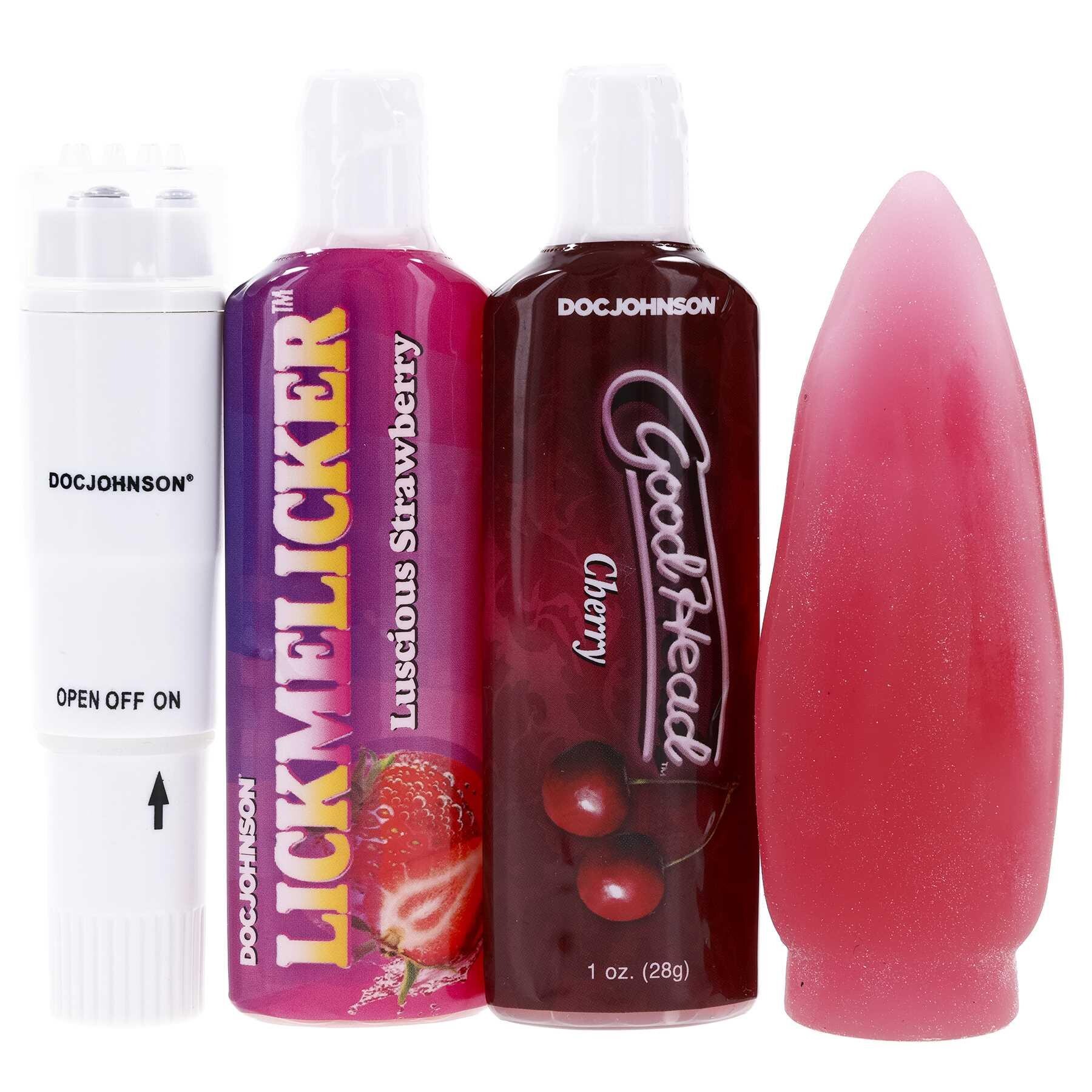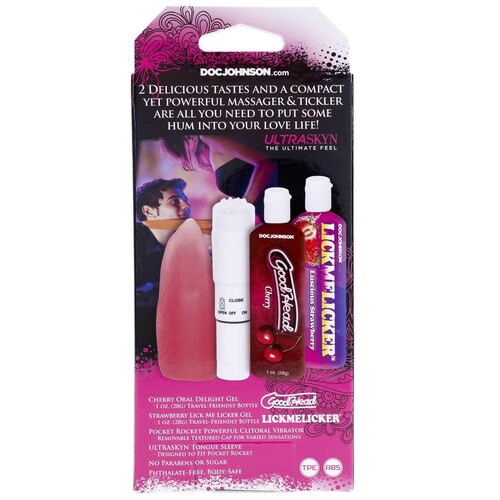 Lick & kiss your way to mind-blowing oral with this fun-filled kit! Fruit-flavored gels tickle your taste buds as your tongue teases your lover all over. A stimulating vibe with tongue-shaped sleeve sweetens your thrills even more. It’s everything you need to make oral even more fun! 4 by 1 inches long vibe. ABS, TPE, & PVC. Uses 1 AA battery (sold separately).
