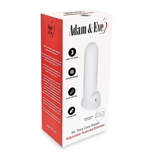 Bulk up your rod with the Mr. Thick Sheath from Adam & Eve! This girthy sheath is the ultimate enhancer since you can customize it based on your needs. The sleeve itself adds 1 inch to your length, and it comes with 2 removable spacers that fit inside the tip. Each spacer adds 1 more inch to your length. If you use them both, that adds an extra 3 inches to your shaft for super-deep thrusts! The sleeve’s extra-thick padding greatly increases your girth as well, so you can fill up your partner and leave them fully satisfied. Its textured interior adds stimulation during playtime. A ball strap helps you last longer & keeps the extension securely in place. Measures 8.5 by 3 inches total; interior is 8.25 by 1.1 inches. Made from TPE.
