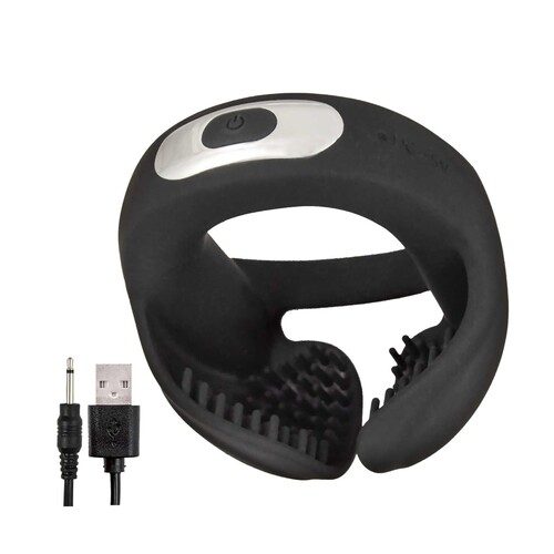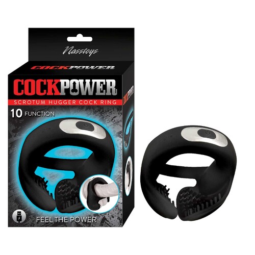 Get executive-level erection support plus give your testicles a targeted buzz with the Cockpower Scrotum Hugger Penis Ring! This super-smooth silicone ring slides down and hugs the base of your erection, keeping you firmer and harder. Two ultra-soft and flexible silicone flaps gently cup your testicles. Each is lined with tiny ticklers for an extra tease. Now fire up powerful 10 function vibration. Feel speeds, pulsation, and patterns make all those ticklers shake for intense balls-focused sensations! 3 by 3 inches, 1.5 inches inner ring diameter (unstretched). Silicone with ABS plastic detail. Rechargeable.