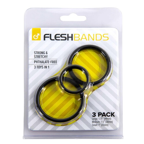 Rock your biggest, hardest, most impressive erections ever with ease! Experiment with all 3 of the Fleshbands C-Rings. Fleshbands are slightly thicker and offer firmer support than traditional penis rings. This set comes in 3 different sizes for use on your shaft, balls, or both! Each stretchy and ultra-smooth band goes on easy with a drop or two of water-based lube. Try one to boost your size and stamina, double ‘em up for mega-hard thrusting, even put on all 3 at once for high-performance results and explosive O’s. Silicone. In 1, 1.5, and 1.75 inch diameters, each stretches to fit.