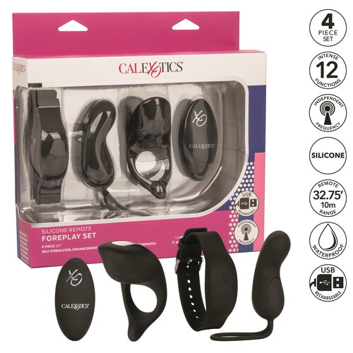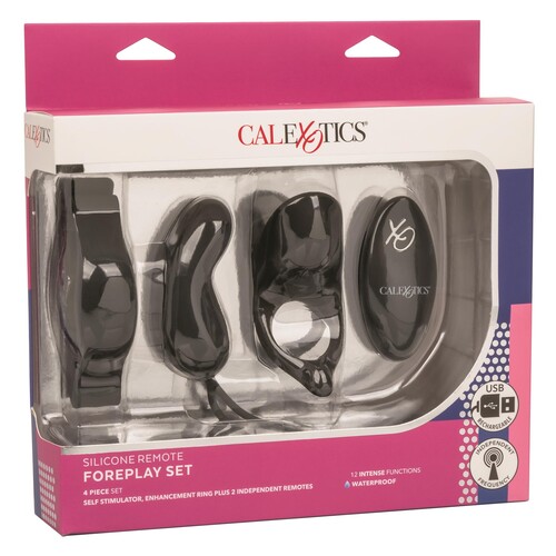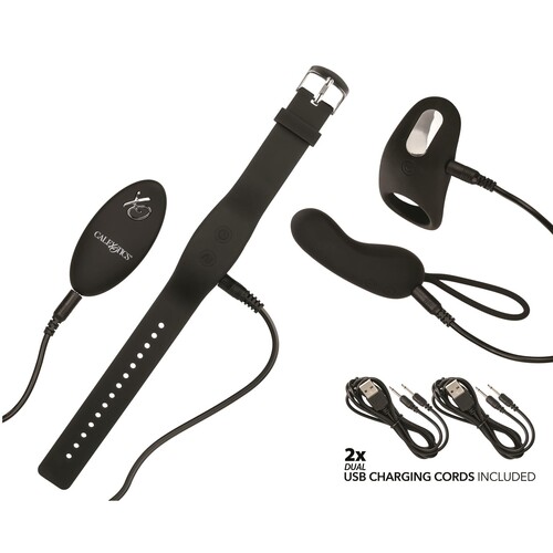 Calling all couples – this fun-filled set is made for sharing! Give one vibe to your lover, while keeping the other for yourself. Then swap remotes so you can buzz their bits with powerful vibrations while they do the same to yours! Waterproof. 3 by 1.25 inches curved bullet; 3.5 by 1.75 inches vibrating ring. Silicone with ABS plastic, stainless steel clasp. Rechargeable.