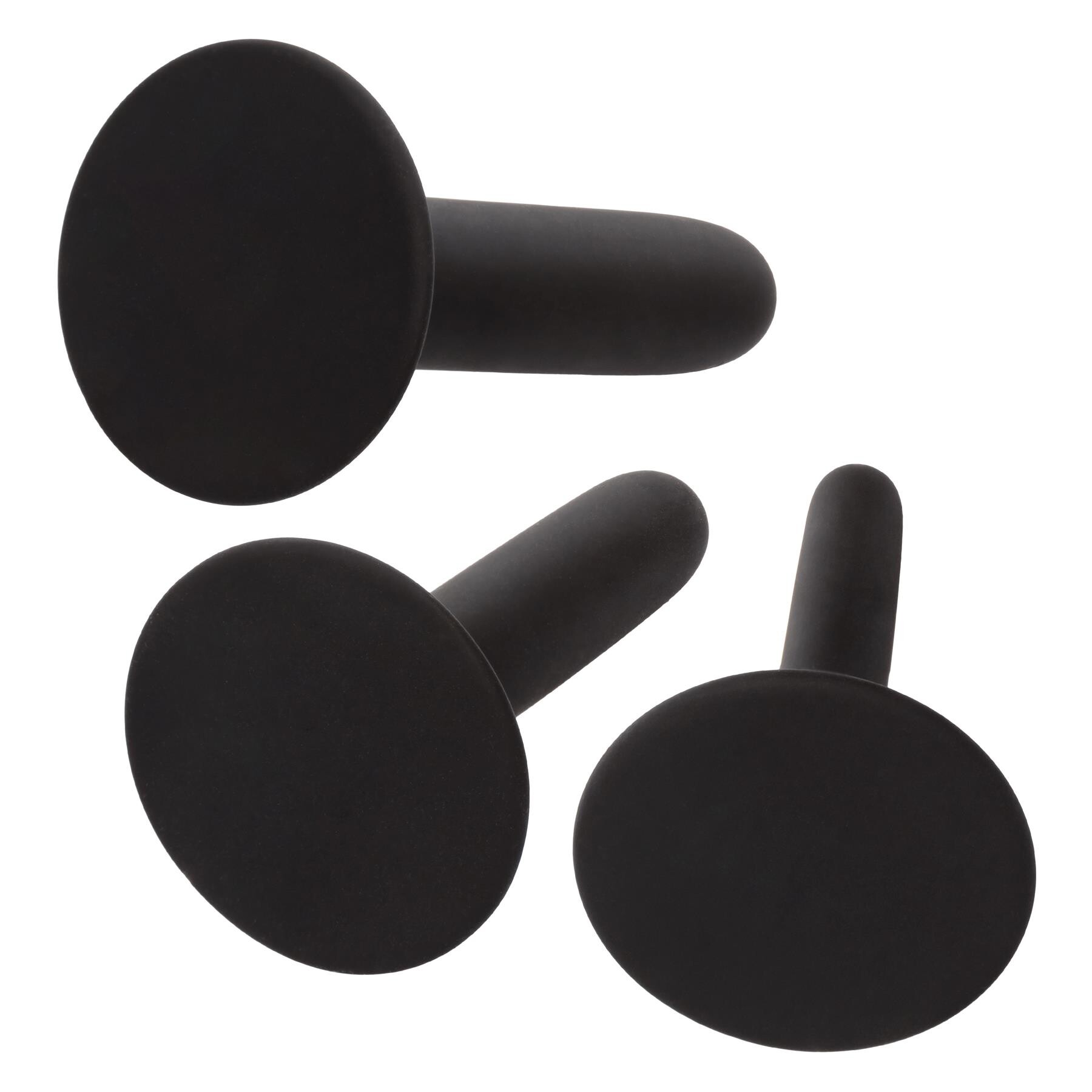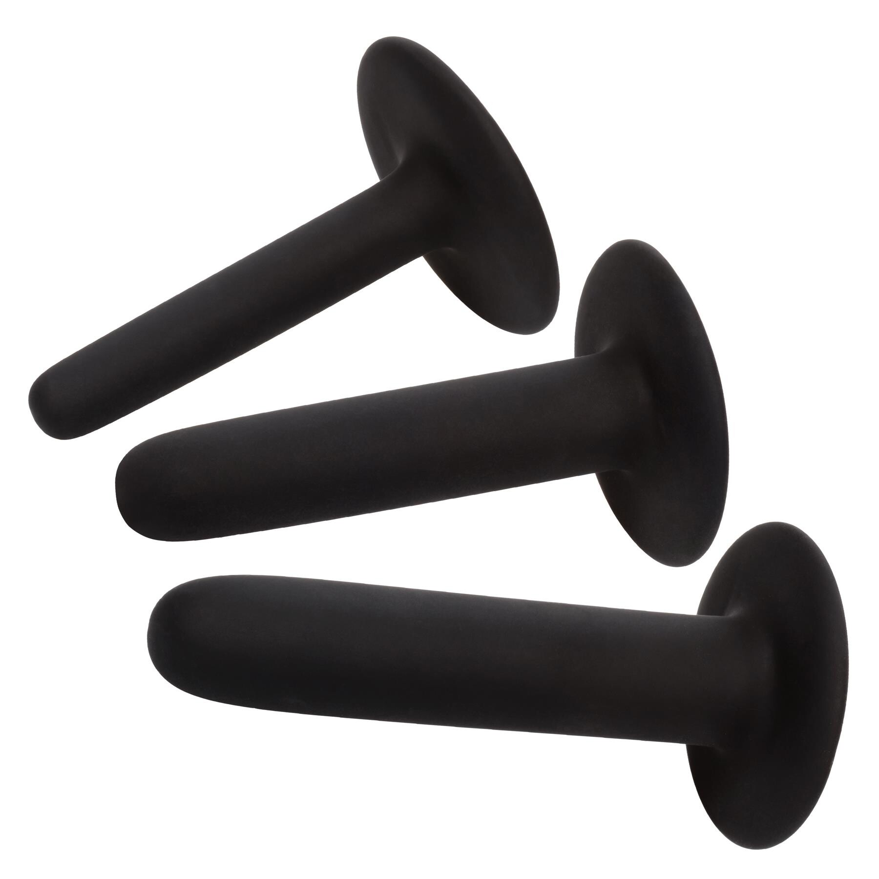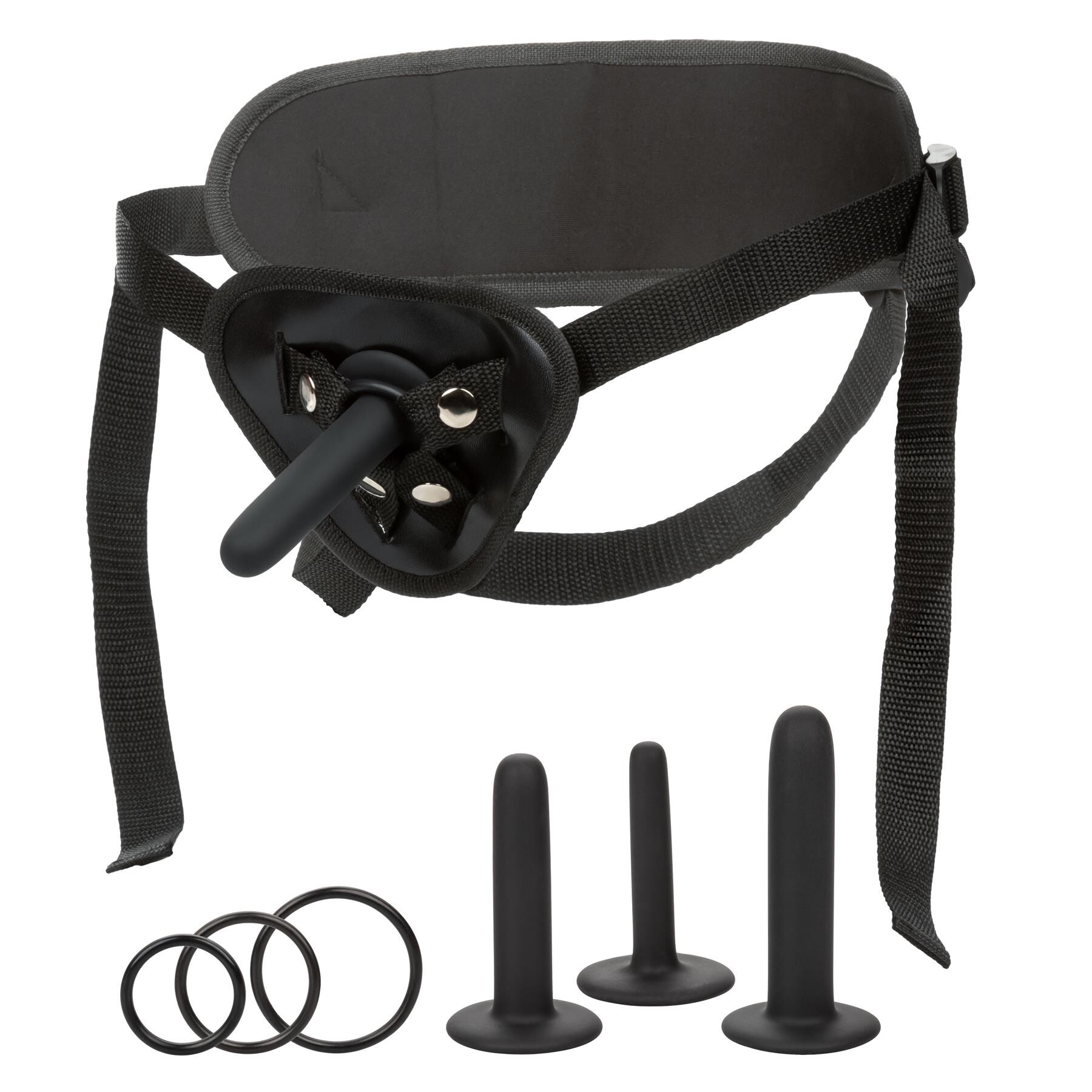 Giving or receiving, this kit thinks of everything to ease you into the thrills of backdoor fantasies and the joys of pegging! What is pegging? Well, it's usually when a woman wears a strap-on to enter her male partner's willing and receptive backdoor. His prostate gets a good massage and she's on top –– literally. Sounds good? Then keep reading! This anal pleasure set is made to play with 3 graduated sizes of pegging probes, a universal harness, and 3 graduated sizes of support rings, each sized for its corresponding probe. The trio of silicone probes are graduated in size to help you get started as a newbie, then work your way up to pro. The fully adjustable harness lets you switch out and change rings/probes easily & quickly –– as the passion mounts! You can also add other dongs and dildos from your sex toy collection to this harness. PU (harness), polyethylene (harness lining), ABS (buckles), polyester (straps), nickel-free alloy (snaps), silicone (probes, rings).