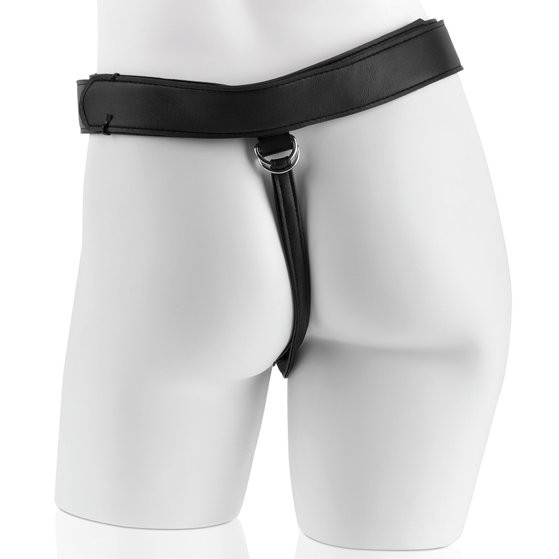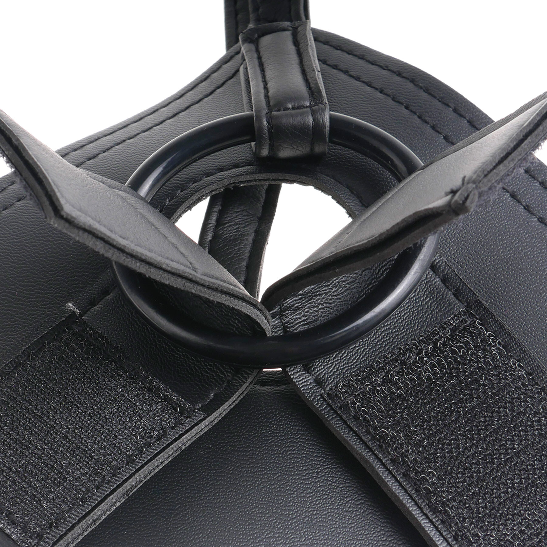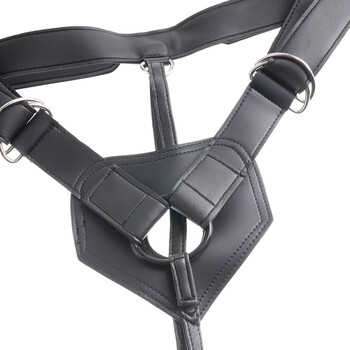 Enjoy the look and feel of the real thing with this rugged strap-on harness and realistic dildo! Designed for intense thrills, this heavy-duty harness can deal out some powerful thrusting. It comes with 3 interchangeable O-rings to fit almost any size toy. Don't have something suitable for strapping on? No worries - it comes with an ultra-realistic dildo for use right out of the box. The included dildo even has a suction-cup base for solo use. The adjustable harness fits up to a 52-inch waist. Dildo is 6.5 inches total length; 6 by 1.5 inches insertable. Faux leather harness with PVC dildo.