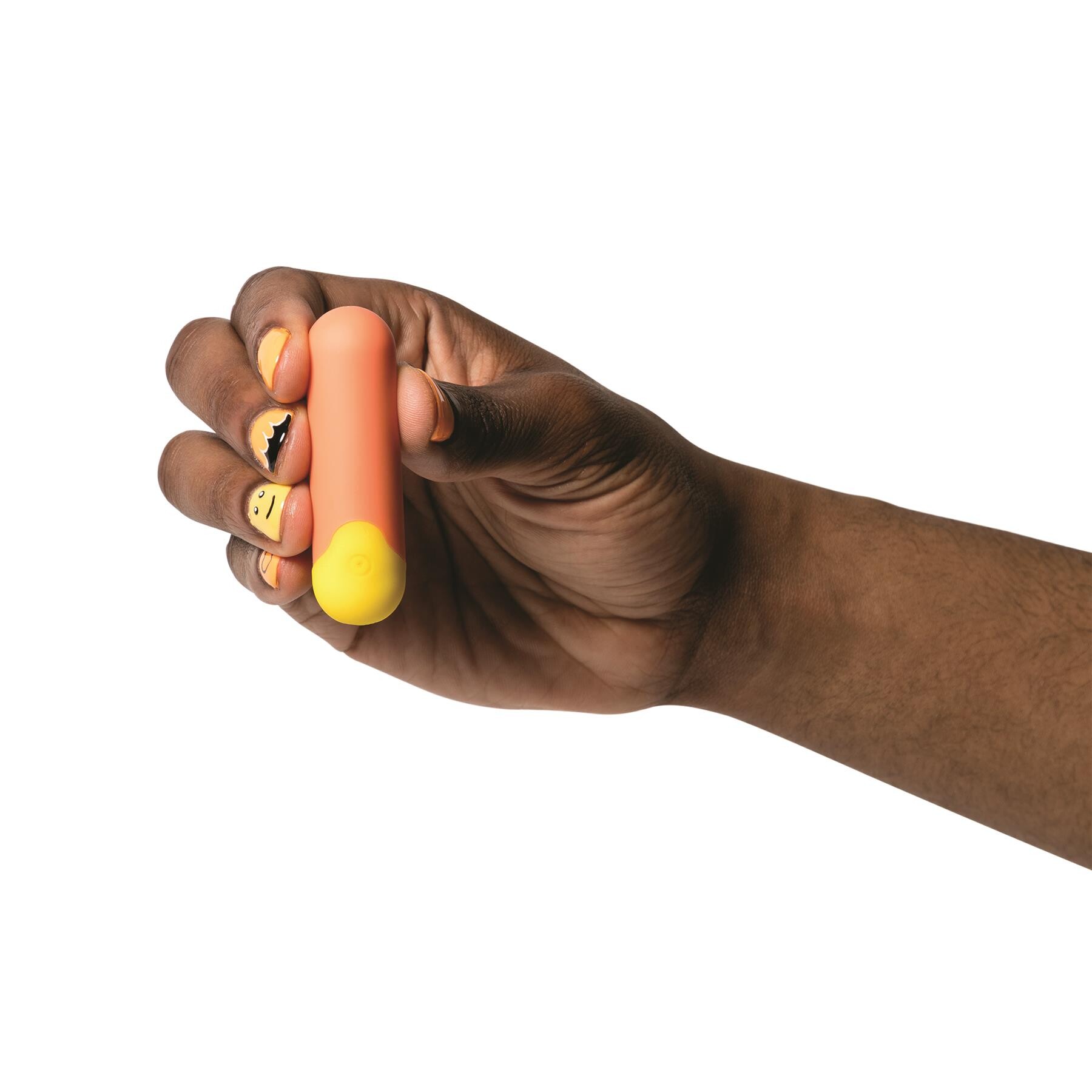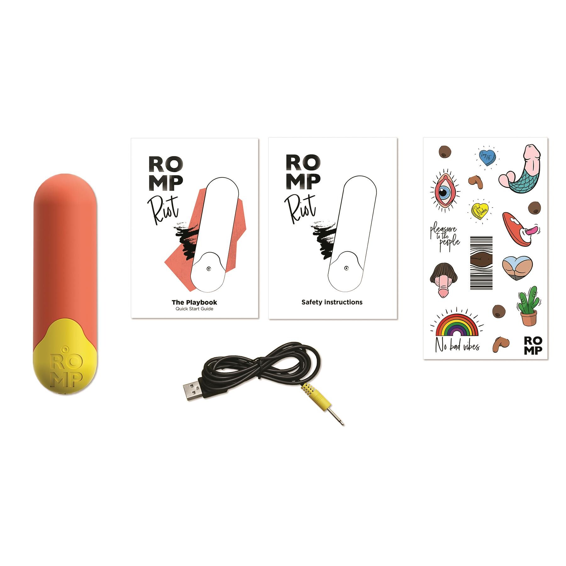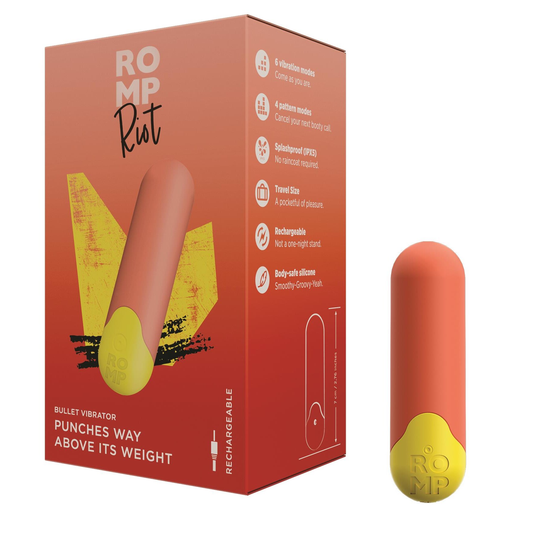 Morning, noon, night – any time is a good time for pleasure with the Romp Riot Bullet Vibrator! This bright rechargeable bullet’s firm and smooth surface is great for teasing and pleasing all your hot spots. Explore 10 vibration functions including 6 speeds and 4 pattern settings! Its small size is perfect for hiding in pocket or purse for spontaneous pleasure anywhere. 2.75 by 0.75 inches. ABS plastic with silicone control button. Rechargeable.