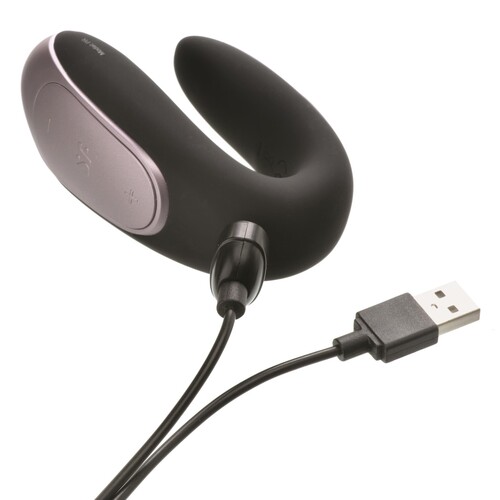 Add some powerful shared stimulation to your lovemaking! The Satisfyer Double Fun's U-shape is made to be worn - and enjoyed - during sex. The slender vibrating arm slips inside her body to concentrate on her G-Spot and vagina as well as his penis! The larger arm presses against her clit for more direction stimulation and to help her hold the toy in place. Each arm has its own vibrating motors for intense rumbling power. Link it to the free Satisfyer Connect app to explore additional vibration modes, design your own settings, sync to music, and much more! Waterproof. Measures 3.7 inches total; 2.5 by 1.7 inches insertable. Made from silicone with some ABS plastic. Rechargeable.