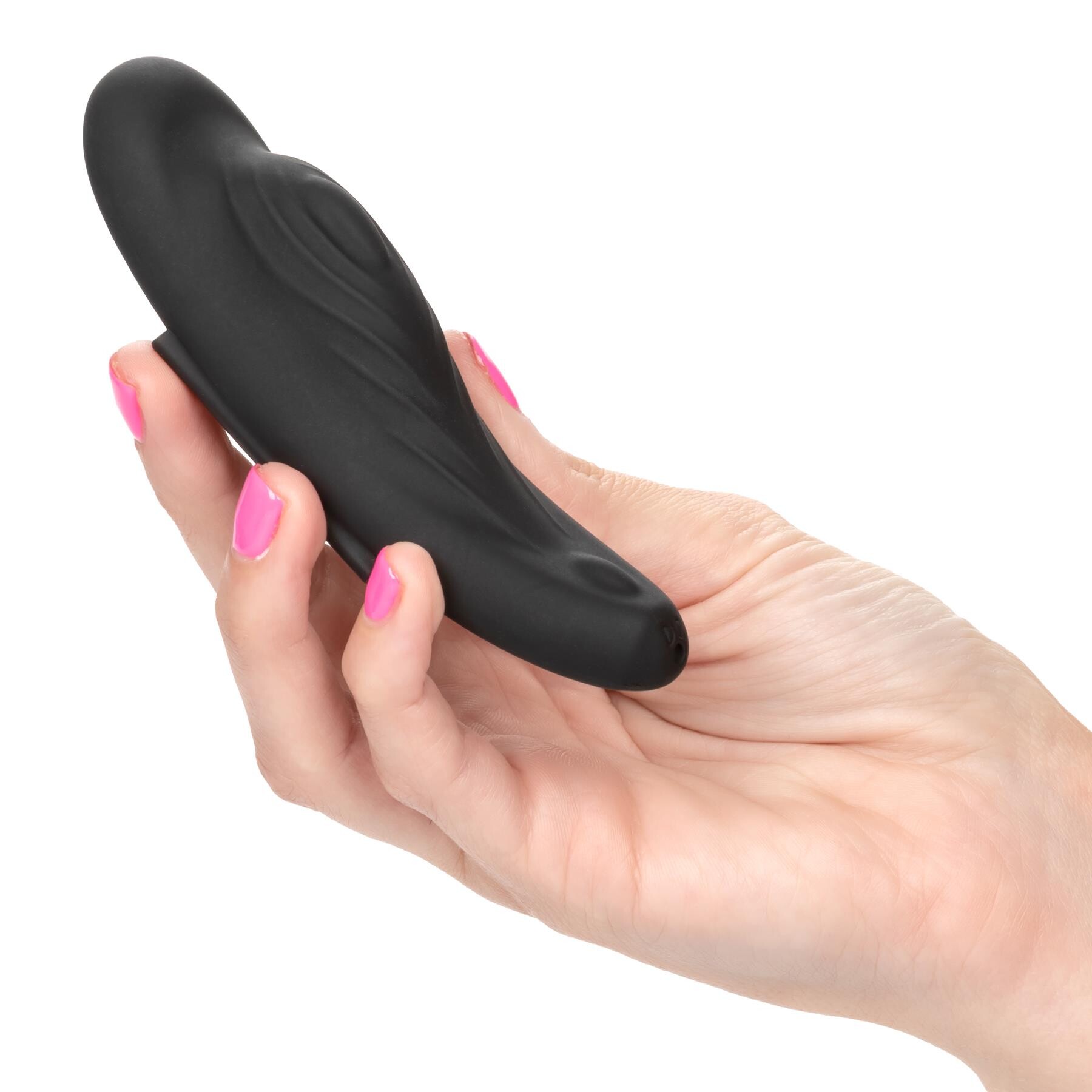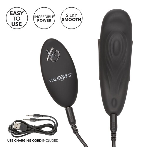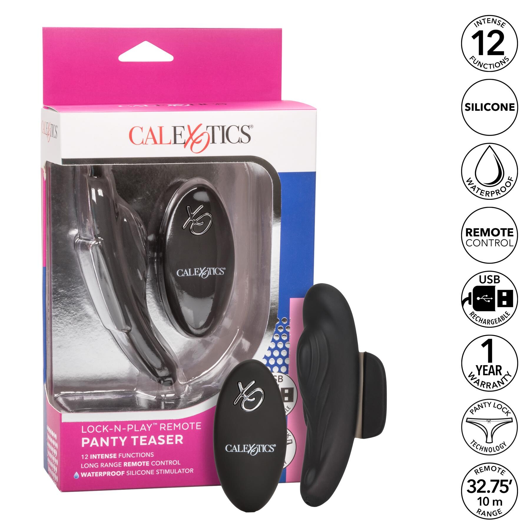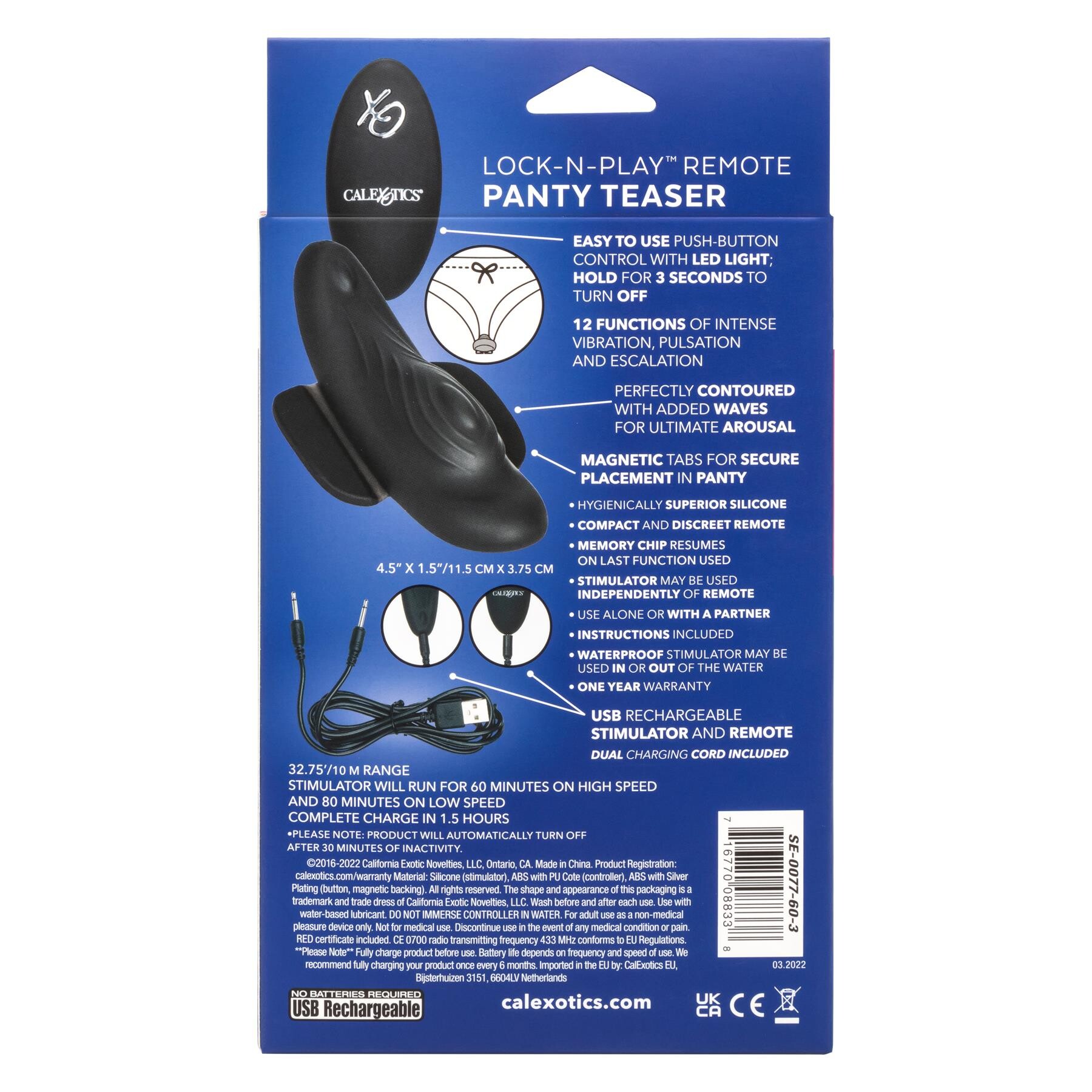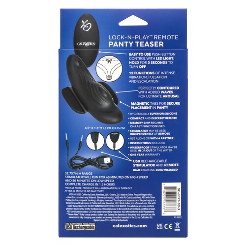 Enjoy stimulating vibrations wherever you go with this discreet teaser! The Lock-N-Play vibrator attaches magnetically to panties, allowing it to work with most pairs. The ergonomic shape fits comfortably between your lips, pressing against your clit for intense sensations. Make your toes curl and body tingle with 12 vibration modes. Change settings quickly & easily with the included remote. Works great around home and in public. Vibe measures 4.5 by 1.5 inches. Made from silicone & ABS plastic with magnetic backing. Fully rechargeable.