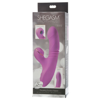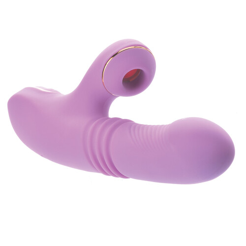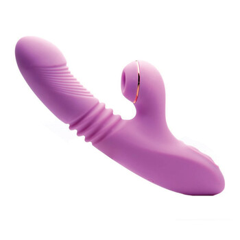 Combine what you love about thrusting rabbit vibes, then add a sucking clitoral stimulator for a bed rocking, out-of-this-world multiple-thrills experience! (Your G-Spot and clitoris will thank you.) The curved G-Spot tip thrusts away with 3 powerful speeds, so you can set the pace. Meanwhile, the clit stimulator tickles your bits with 7 stimulation modes. It's the ideal combination for body-shaking 'gasms! Waterproof. Vibe runs up to 90 minutes. 9 inches total length; 4.5 by 1.45 insertable. Made from silky soft, body-safe silicone with ABS plastic base. Rechargeable.