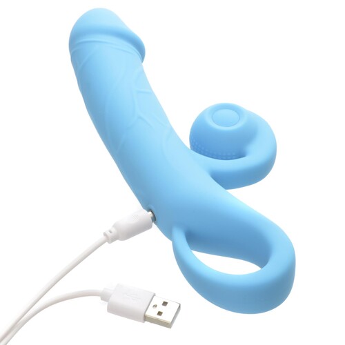 With its shaped head, veins, and details, this big ‘n’ satisfying silicone toy’s 10 function vibrating shaft feels so good sliding in. Once it’s there, a nubby 10 function vibrating clit bumper buzzes your hot spot with every thrust and grind! Dual motors in the shaft and bumper target your G-Spot and clit simultaneously for powerful, body-shaking blended O’s! Silicone. 7.87 inches total length, 4.5 by 1.46 inches insertable. Rechargeable.