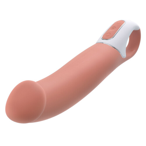 And with just enough flex so that you'll never stop playing with it? Does your special place yearn for something a little more... XXL? Then lube it up and let this bad dude slide on in! He's a hefty phallic dong that vibrates with a dozen body-rattling programs to choose from. Waterproof. 9 inches total length; 6.5 by 1.8 inches insertable. Silicone and ABS plastic. Rechargeable