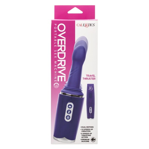 Love all the power of a big plug-in machine – but it just won’t fit in your travel bag? Then you must get your hands on the Overdrive Portable Thrusting Sex Machine! It fits right in your hand for erotic adventures anywhere. Feel super-satisfying penetration with 5 intense thrusting speeds. 10 body-rocking vibration functions make your pleasure even better. Independent controls let you choose from 50 sensation combinations. Done playing? A sturdy cap protects the machine while you’re en route to sexy action. 9.5 by 2.5 inches total, 4 by 1.25 inches insertable shaft. Silicone shaft, ABS plastic case. Rechargeable.