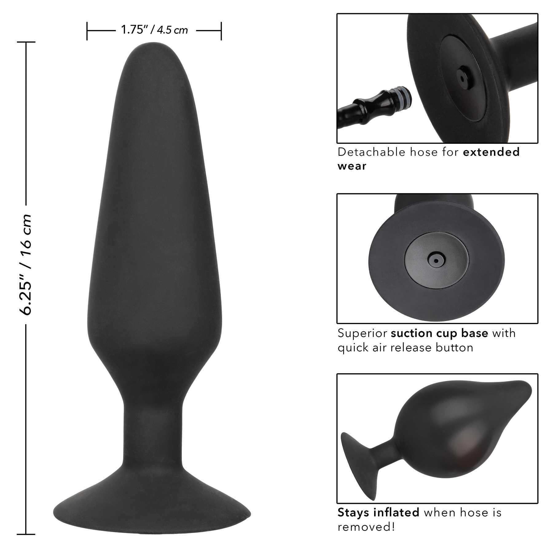 unlike other inflatables... i love the narrow base on this one...this really keeps it in there as you inflate it. the urge "will be" to poop it out as it inflates, but it wont go anywhere with the narrow base shape. Ive had it (for me) not very inflated at about 8 pumps and gone out to the food store etc...with it in me. detachable hose-pump makes this easy to do. Quality is decent compared to o... Read more