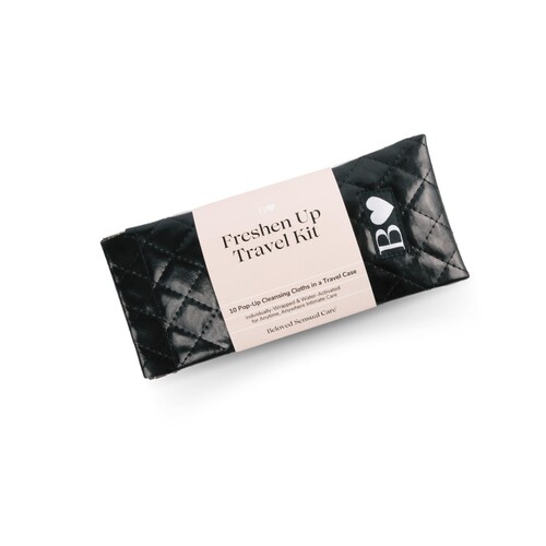 We’ve all been there: you’re in the mood, but there’s no time for a quick shower. Enter the Beloved Freshen Up Travel Kit! The discreet quilted luxe Travel Case looks like a cute wallet or sunglasses holder. But inside, you’ll find 10 Pop-Up Cleansing Cloths! Each comes in an individually packaged compressed disc for easy travel. Open and add water. The disc expands into a luxurious cleansing cloth that’s perfect for banishing unwanted moisture and odors. Be clean, cool, and confident – and always ready for play! Pop-Up Cloths made from 100% plant fiber. 8 by 12 inches each once expanded. From Beloved, a woman-owned company dedicated to luxurious pleasure experiences.