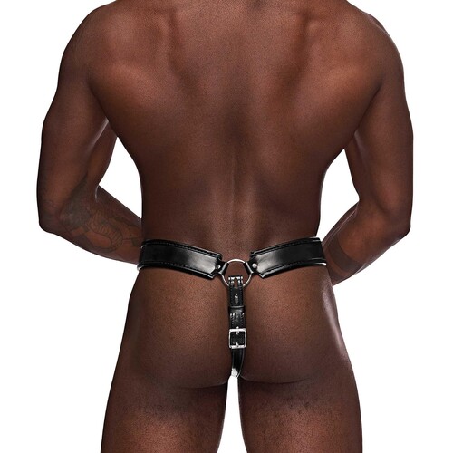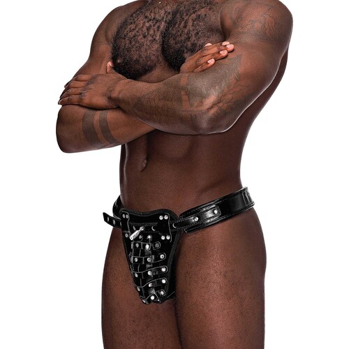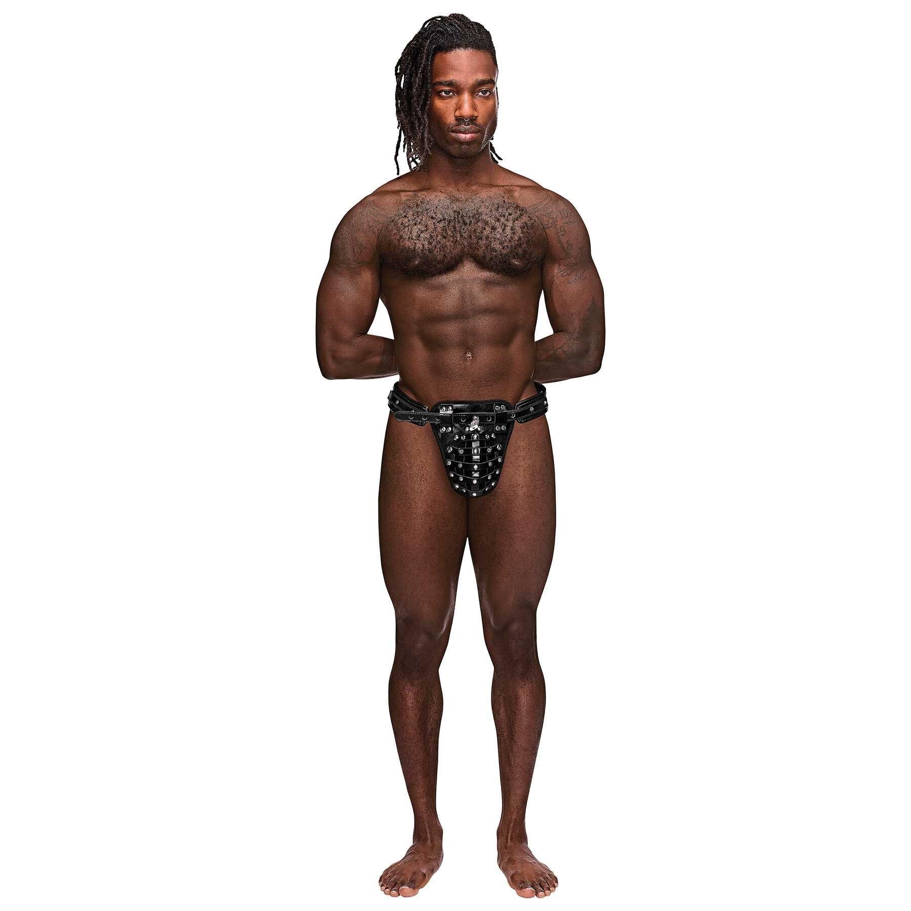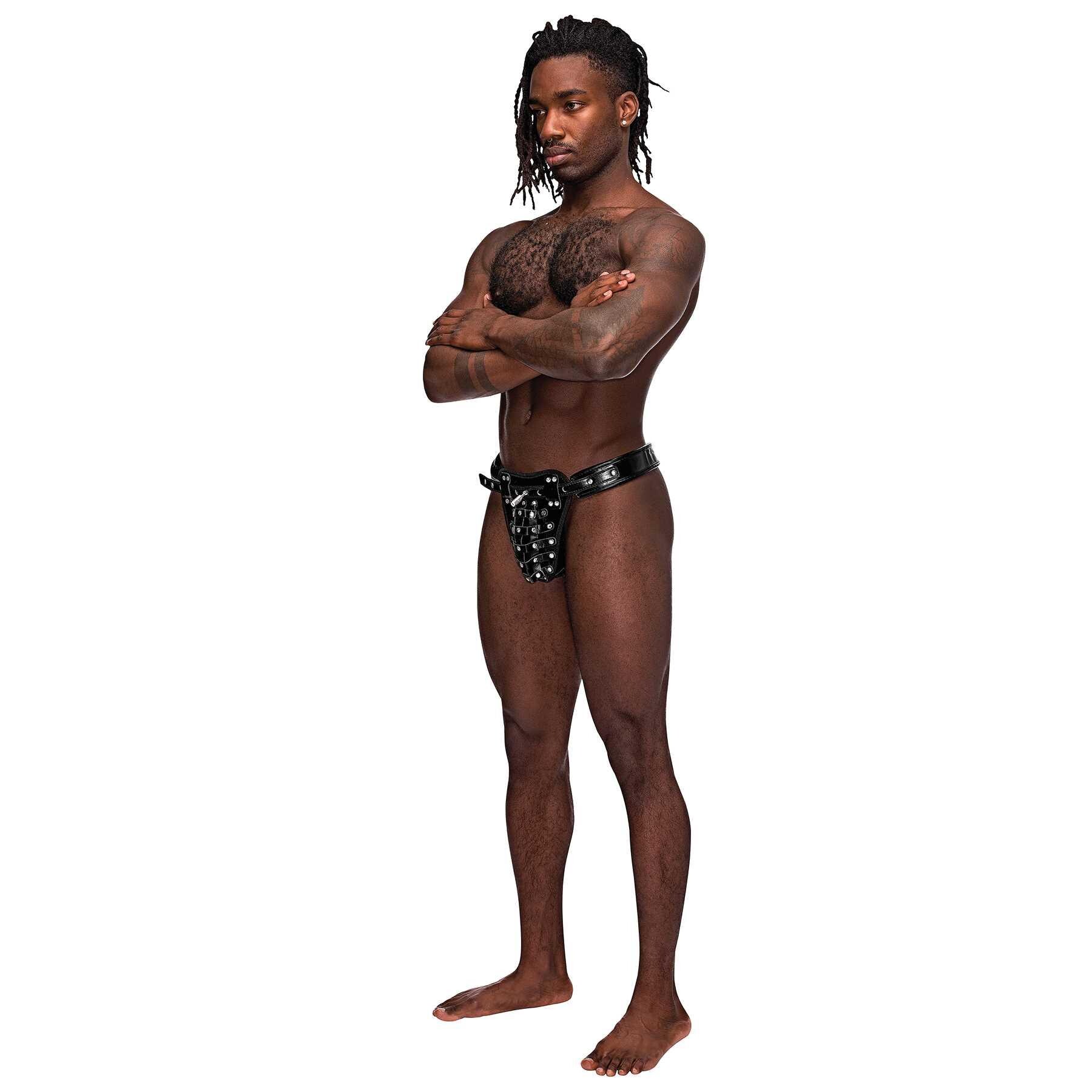 Taurus: a sensual, hedonistic, and uncompromising creature, full of power and lust. Just like its namesake, the Taurus Thong shows off your package with uncompromising taste and unsubtle kink. Plus an edgy twist: this thong features a chastity lock & key in front! Own it –– or be owned. One size. Made from faux leather with metal accents.