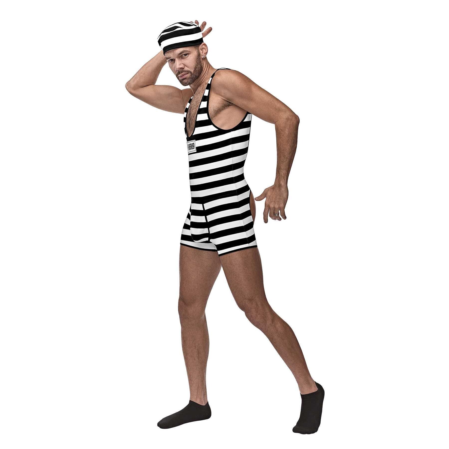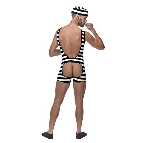 You’ll be charged with crimes against everything but fashion when you wear this sexy prison singlet! Black & white horizontal stripes span your sexy body. Watch them stretch around your contraband (yeah, there’s a pocket for your bulge)! Turn around, the open butt is designed with sexy strip searches in mind. Your prison number is proudly displayed right on your chest: #696969! You even have a matching striped hat to tie the whole number together. Great for sexy roleplay, gag gifts or Halloween! Made of Polyamide & Elastane. Imported.