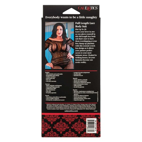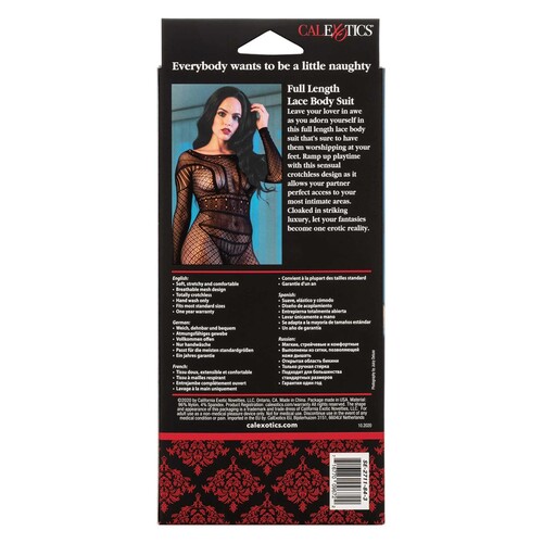 Make all your wildest fantasies a reality in this erotic body suit! Crafted from buttery soft and stretchy material, all you have to do is shimmy in through the top opening. You’ll love how the body suit’s lace paints your arms and legs in intricate diamonds. Cleavage-enhancing lines give your bust an extra-shapely look, while cheeky V-style accents in front and back emphasize your hips and booty.
