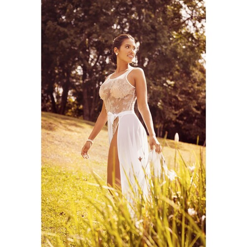 Once the reception’s over, it’s time for the real fun to begin with the Wildly In Love Bodysuit! This bridal lingerie is made from demure white mesh and lace for a honeymoon to remember. It’s decorated with a lovely floral pattern and faux pearls that cling to your breasts for a stunning look. The back laces up like a corset, so you can adjust it to fit a wide range of body types. Skimpy thong flaunts your rear. Hook and loop crotch offers easy access when you’re ready to play. Made mostly from polyamide. Imported.