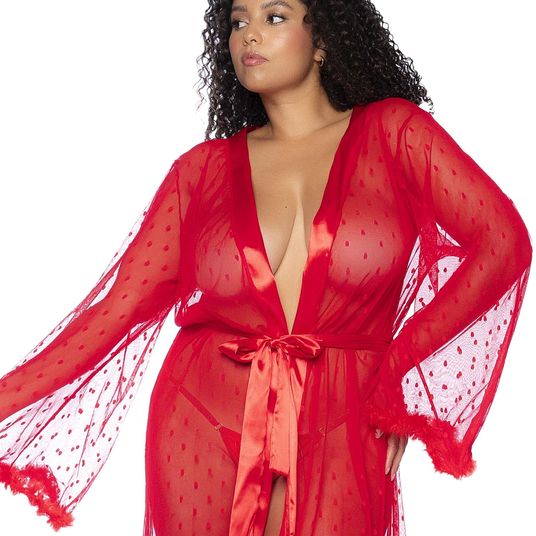 Look striking & sexy this season in Eve’s Exclusive Holiday Robe. You’ll be the picture of luxury & sophistication in this floor length robe. Flowy, open arms are lined with feather trimming that runs around the sleeves and the base. Along the middle, smooth & shiny satin rib lines the robe – perfectly matching the belt. Tie into a sweet bow, then, suggest your lover unwrap you. Will the sexy surprise underneath be a lingerie set or nothing at all? You decide! The see through mesh will give them a sexy sneak peek either way. The dotted pattern looks so festive, you’ll be the greatest gift they’ll get this year!
