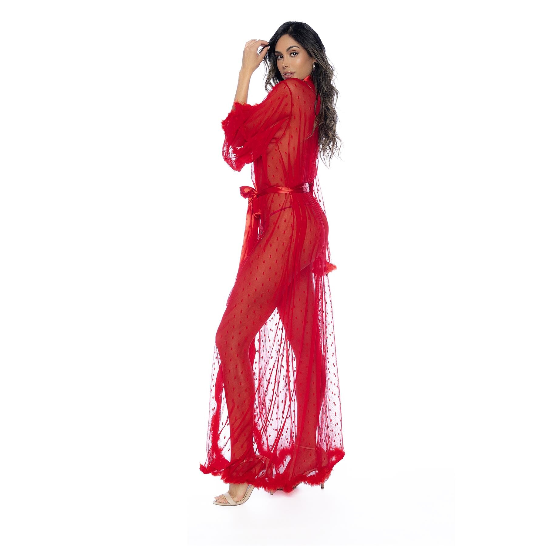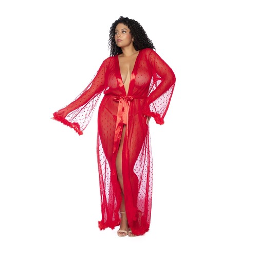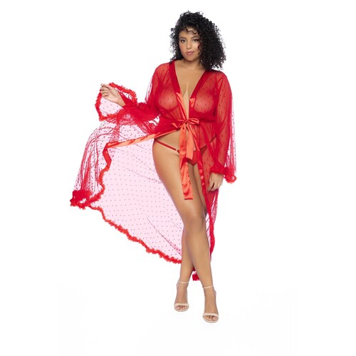 Step into the holiday season looking sexier than ever! This glamorous robe is a striking red hue, perfect for catching their eye. See-through mesh material spans your sexy body, trailing down past the ankles. Bright feather lining trims the bottom and arms. The middle is lined with shiny satin that matches the beautiful belt. Tie it up in a cute bow, you’ll look like one hot present! Encourage your lover to tug on the bow to unwrap a sexy surprise. The dotted pattern adds a special festive flair. Pair with your favorite heels from home. Looking for the perfect lingerie set to match? Shop dozens of styles right here at adameve.com! Made of 100% Polyamide. Exclusively sold at Adam & Eve. Imported.