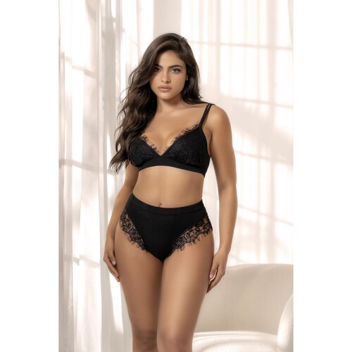 Enjoy full coverage with a sexy touch of lace! Made for teasing, this 2-piece lingerie set turns up the heat during foreplay. The triangle top hugs your girls nicely while a lacy overlay adds a cute touch. The matching panty sits high on your waist for a cheeky look. Made from polyester, cotton & elastane. Imported.