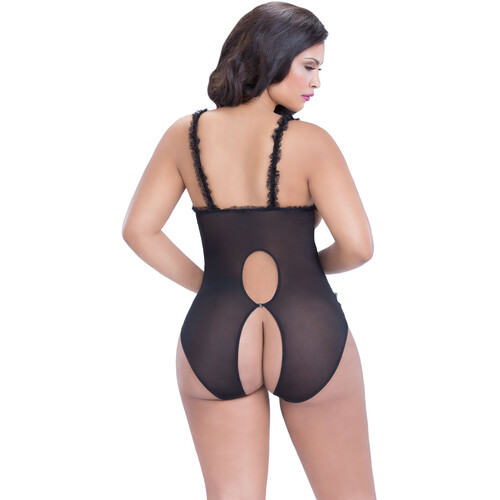 Put your assets on full display in this open cup and open crotch teddy! Slinky sheer lace mesh hugs your figure while the open underwire cups give your girls a sexy lift. The full open crotch leaves room for every kind of erotic play. Ruffle details add fun, feminine flair. Nylon/Spandex. Imported.