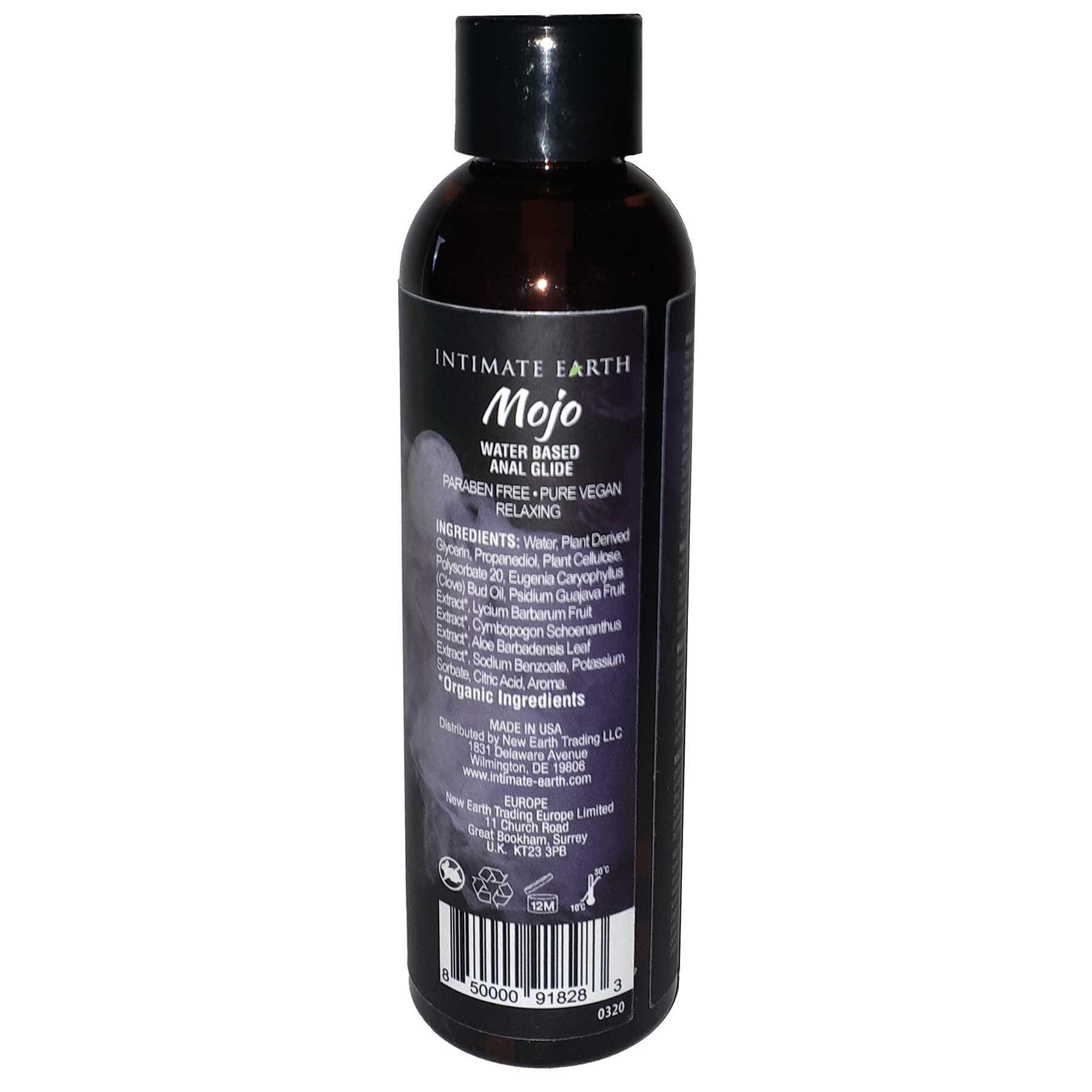 Intimate Earth Mojo Natural Water-based Anal Relaxing Glide comes in a 4 oz bottle with flip top. The certified vegan-friendly formula is safe to use with condoms and all types of sex toys. It doesn’t contain any parabens, Lidocaine or Benzocaine.