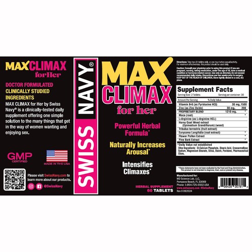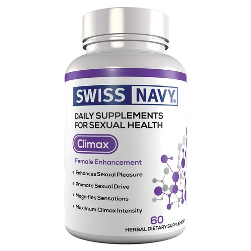 What if you could have drastically better, more intense O’s? What if every happy ending felt like an earth-shaking experience? And what if you could have more of them than you ever dreamed? If you want to perform at your ohh-mazing peak, you need Swiss Navy Climax Female Enhancement Daily Supplements. This safe and effective herbal formula contains “O” intensifiers and aphrodisiacs including Maca Root, L-Arginine, Horny Goat Weed, Tongkat Ali, and more! Plus Vitamin B-6 and Zinc to get your blood pumping and desire flowing. For maximum intensity and results, take two capsules daily. Made in the USA. 60 count bottle.