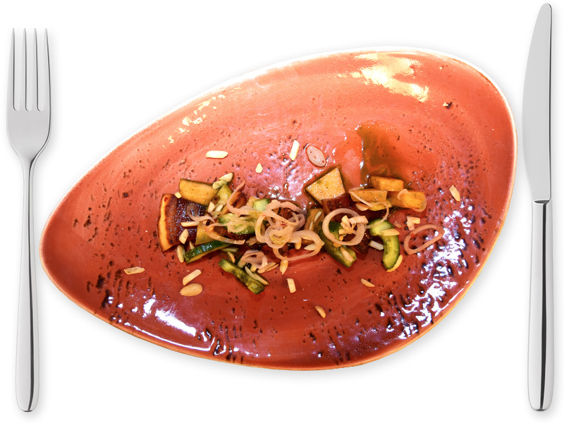Salad of Cantaloupe Melon with Anise pickled Watermelon Basil oil, Cucumbers & toasted Almonds