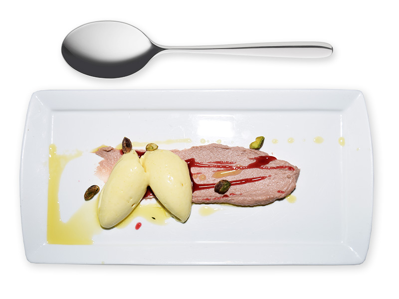 White Chocolate Mousse with Raspberry infused Goat Cheese, Thyme Oil & Pistachios