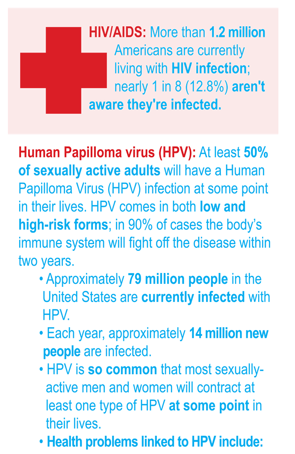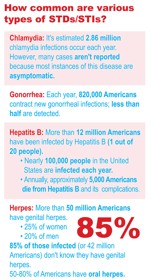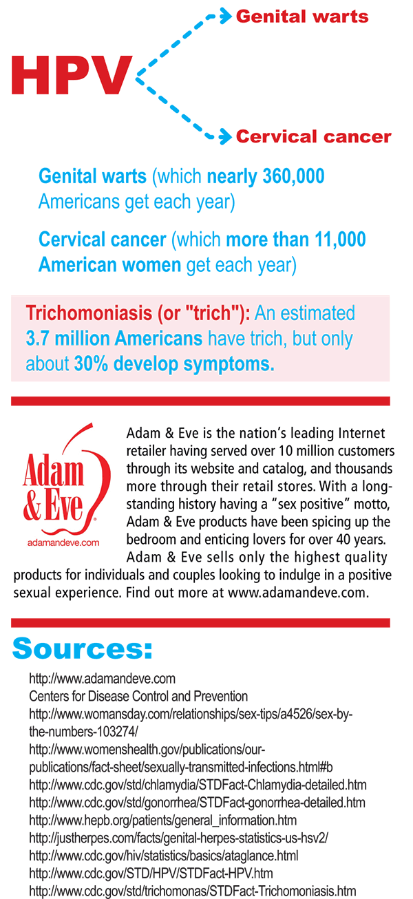 Almost 20 million people are infected with a sexually transmitted disease every year. Here’s some basic facts about the most common types of STDs based on data from the Centers of Disease Control and Prevention and a survey conducted by Adam and Eve.