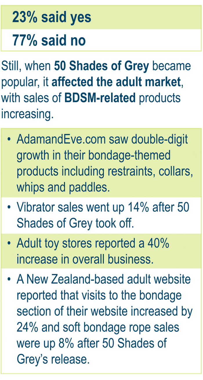 More people than ever are turning to erotic literature to satisfy their sexual fantasies… and then trying them out in the bedroom. Adam and Eve's bondage toy sales spiked by double digits as Fifty Shades of Grey climbed its way up the NY Times Best Sellers list. See other ways erotica can shape your sex life.